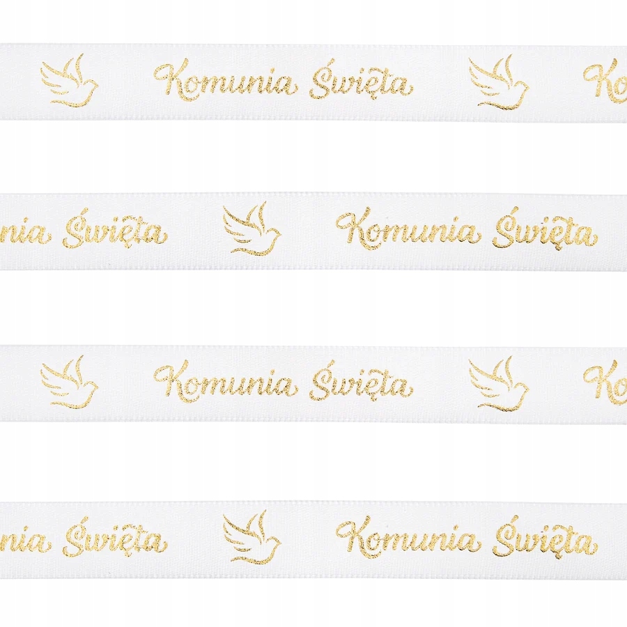 Biała satynowa wstążka ze złotym nadrukiem Komunia Święta i z gołąbkiem. To doskonały element dekoracji prezentów, kwiatów czy stołu komunijnego.