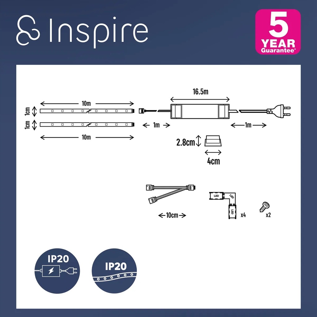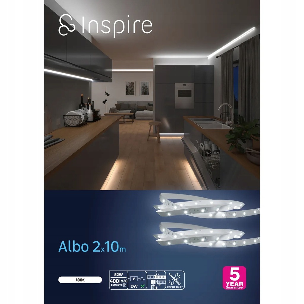 Ta taśma LED z zestawem INSPIRE o wymiarach 2x10 metrów jest idealna do dużych projektów. Dzięki wysokiemu natężeniu światła (400 lm/metr) i neutralnemu białemu światłu (4000 kelwinów) na 20 metrach wstęgi idealnie nadaje się do oświetlenia całego pomieszczenia. Łatwa w montażu, taśma musi być przyklejona taśmą 3M, już na produkcie i można ją dostosować. Rzeczywiście, można go przyciąć co 16,7 cm i ponownie połączyć, aby dopasować się do kształtu i długości projektu dzięki dostarczonym łącznikom "L"
