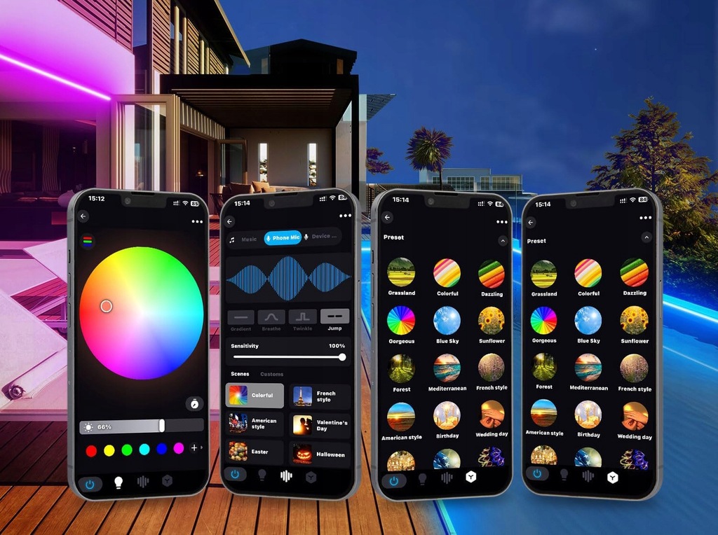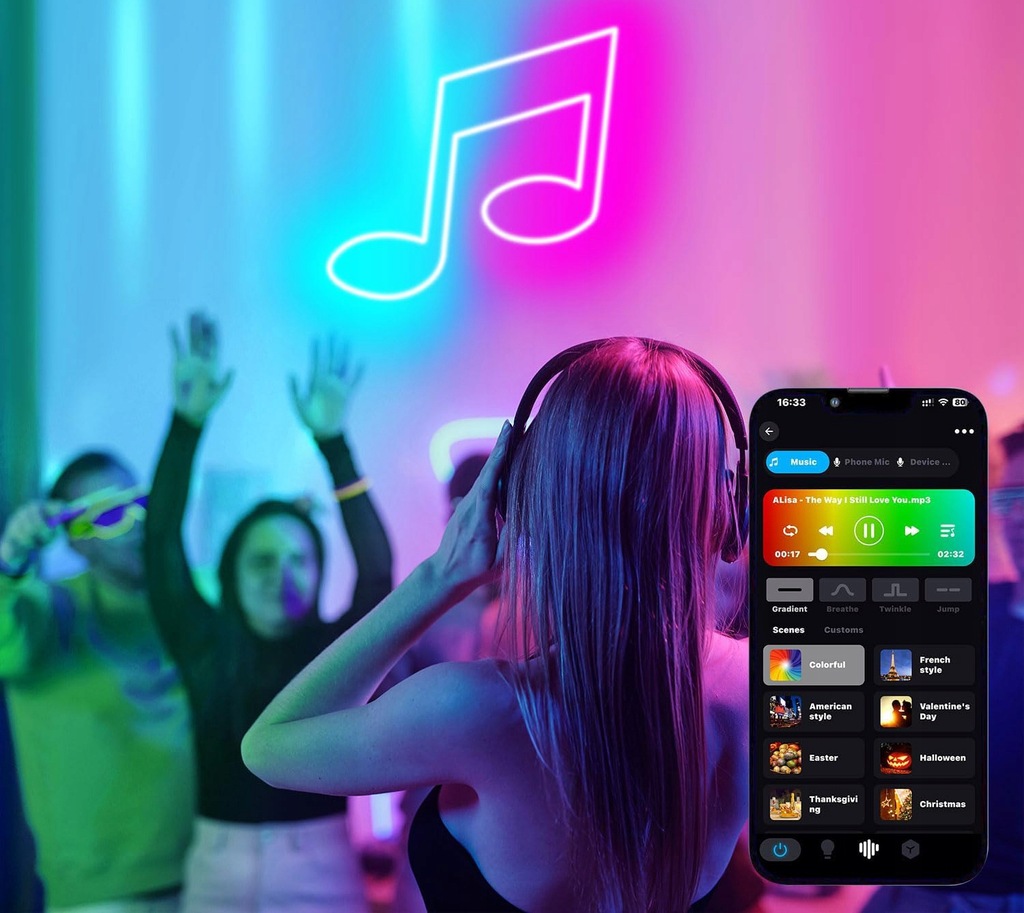 Elastyczna taśma LED RGB neonowa z WiFi: Taśma LED RGB neonowa dostępna jest w trzech długościach (20 m w 2 rolkach, 10 m / 5 m w jednej rolce). Diody zostały ulepszone do 120 LED/metr, co zwiększa jasność! Można dostosować oświetlenie według nastroju i atmosfery sceny. W trybie muzyki i mikrofonu, diody LED RGB neonowe mogą synchronizować się z ulubioną muzyką, a także dostosować styl taśmy neonowej (miganie, oddychanie, zanikanie, skakanie) w aplikacji.