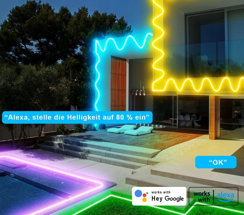 Wodoodporna taśma LED RGB neonowa kompatybilna z Alexa: Wodoodporny inteligentny kontroler WiFi obsługuje aplikację Surplife, która współpracuje z Alexa i Google Assistant. Możesz używać swojego inteligentnego asystenta głosowego do kontrolowania taśm LED neonowych 5M/10M/20M i ustawiać zautomatyzowane zadania w aplikacji (IFTTT). Po podłączeniu do domowej sieci WiFi (tylko 2.4 GHz), możesz kontrolować taśmę z dowolnego miejsca i dzielić się kontrolą z przyjaciółmi lub rodziną.