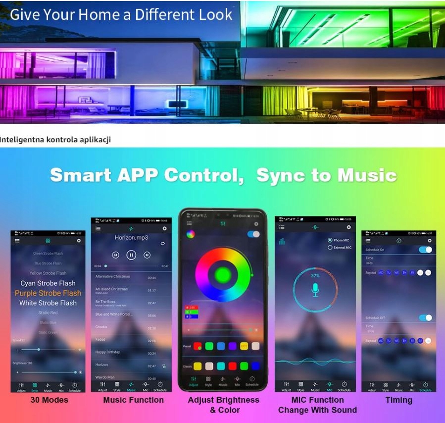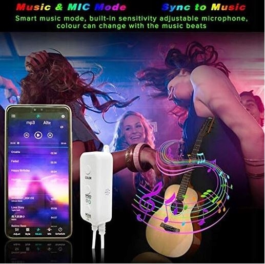 Dzięki wbudowanemu mikrofonowi o wysokiej czułości taśma LED będzie tańczyć z dźwiękiem otoczenia, z głośnika telefonu lub innego głośnika w pokoju. Synchronizuj światła z rytmem dowolnej piosenki lub klaskaniem w dłonie.