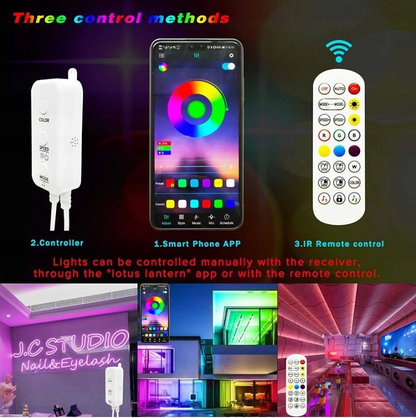 - KONTROLER BEZPRZEWODOWY BLUETOOTH: Przejmij grupową kontrolę nad taśmami za pomocą aplikacji Lotus Lantern; Stwórz romantyczną, relaksującą, imprezową atmosferę dzięki funkcji muzyki i mikrofonu. Funkcja pomiaru czasu pozwala nam włączyć lub wyłączyć światła w dowolnym momencie. Więcej dostosowań i stylów znajduje się w aplikacji.