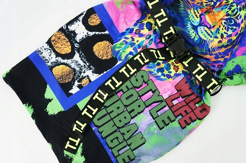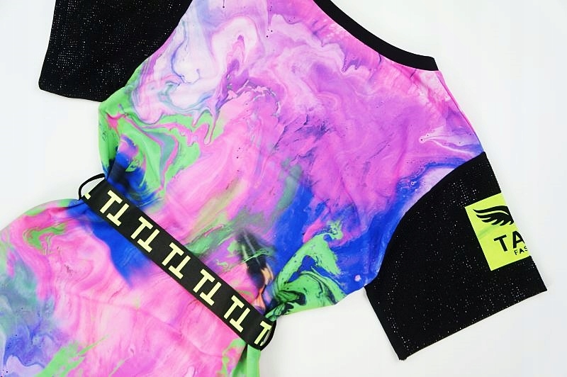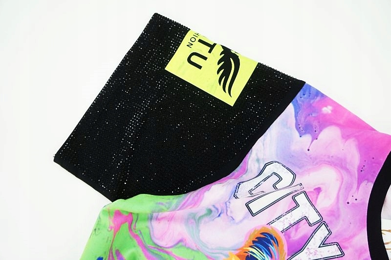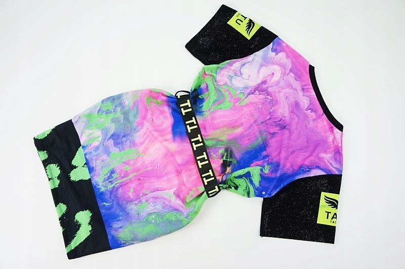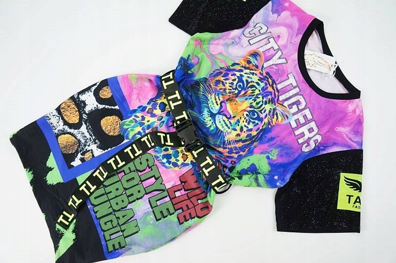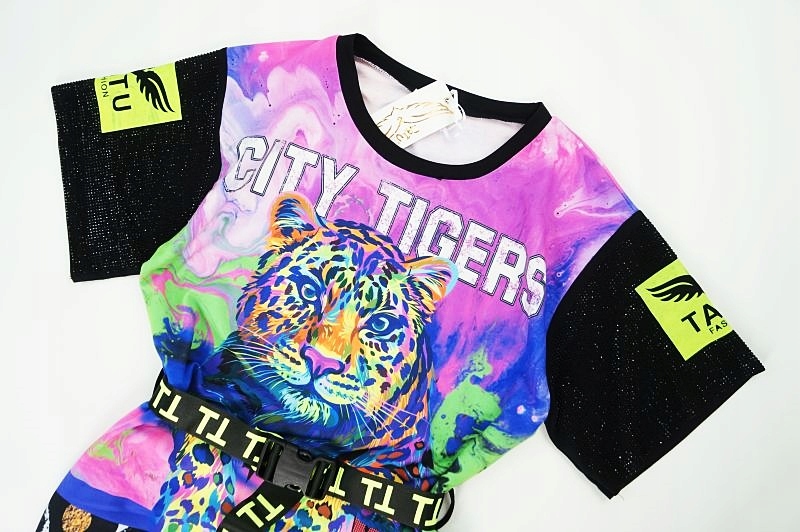 Wykonana z wysokiej jakości elastycznego materiału w odcieniach fioletu, neonowej zieleni i czerni. Fason prosty, zapinana w talii na szeroki pasek. Na rękawkach czarne kryształki. Z przodu mega duży kolorowy tygrys.