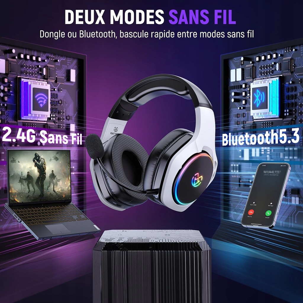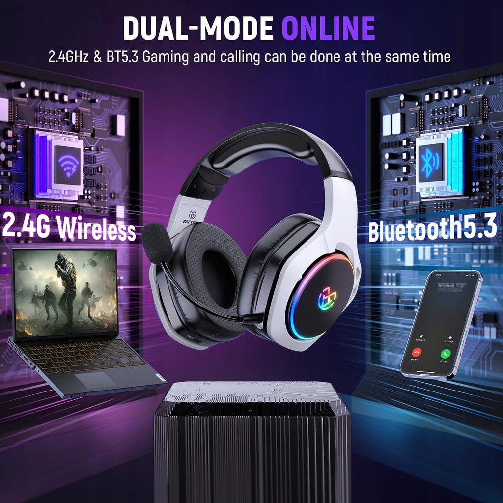Brak kabli o bardzo niskim opóźnieniu: nasze bezprzewodowe słuchawki do gier łączą wysokowydajną bezstratną technologię bezprzewodową 2,4 GHz dla bezprzewodowego połączenia o bardzo niskim opóźnieniu z mniej niż 30 ms, połączenie jest bardziej stabilne, a odległość transmisji jest dłuższa, dzięki czemu możesz cieszyć się wciągającą grą bez opóźnień.