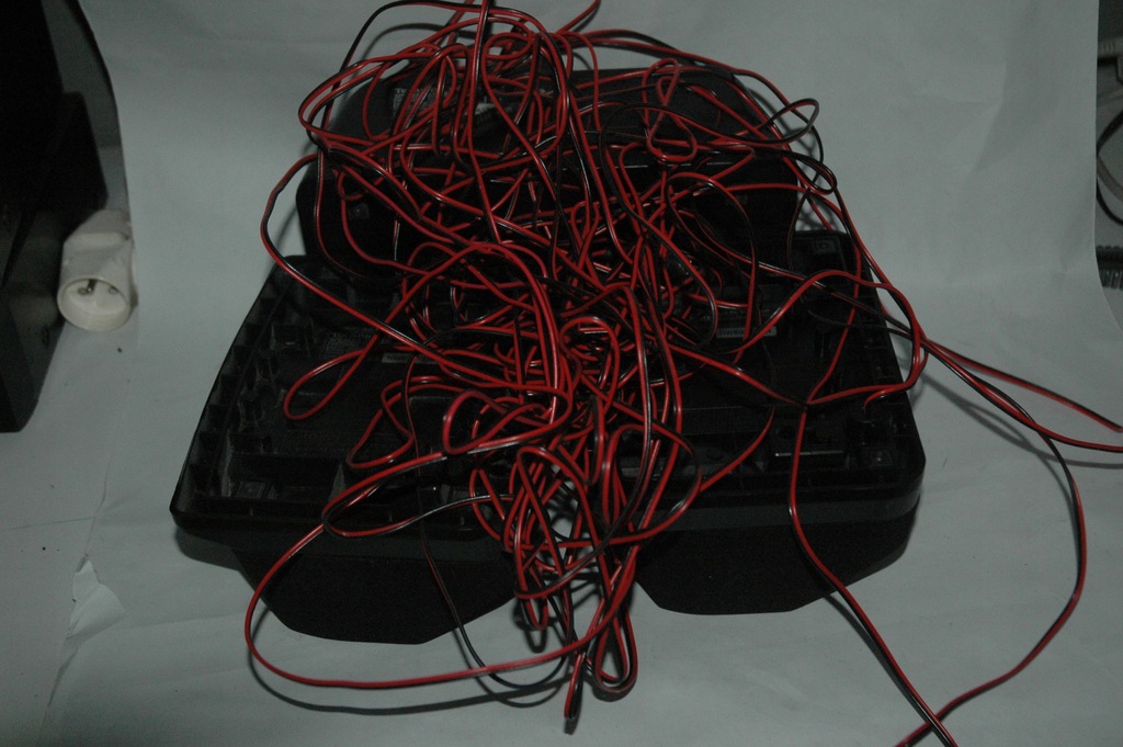 Głośniki posiadają ślady użytkowania. Maskownice miejscami przetarte i przybrudzone.Satelitki mają przewody około 10m, centralny około 2m.