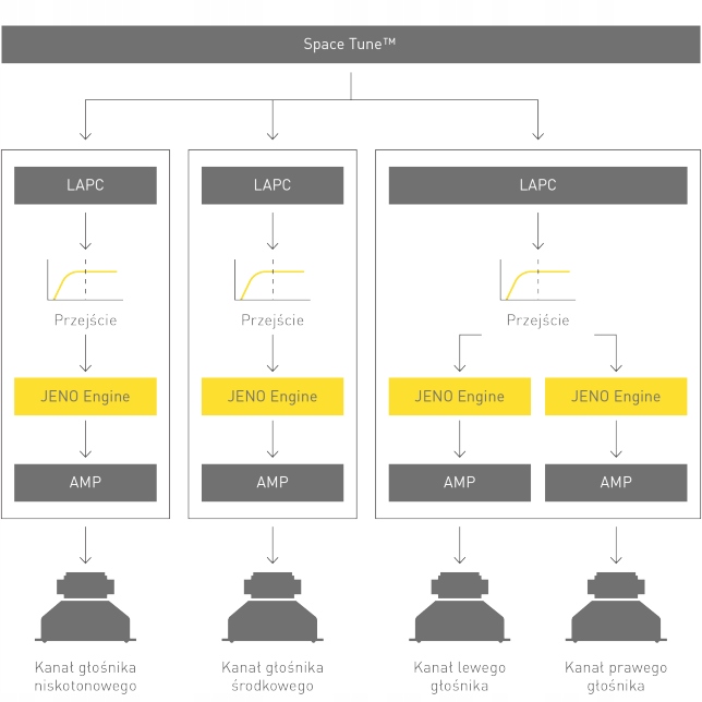Cztery mechanizmy JENO zapewniają optymalną wydajność z doskonałym obrazowaniem dźwięku dzięki dopasowaniu subwoofera oraz głośników średniozakresowych i wysokotonowych. Pozwala to uzyskać perfekcyjne dostrojenie oraz optymalizację przestrzeni dźwiękowych w celu dostosowania do poszczególnych środowisk odsłuchu przy użyciu technologii Space Tune.