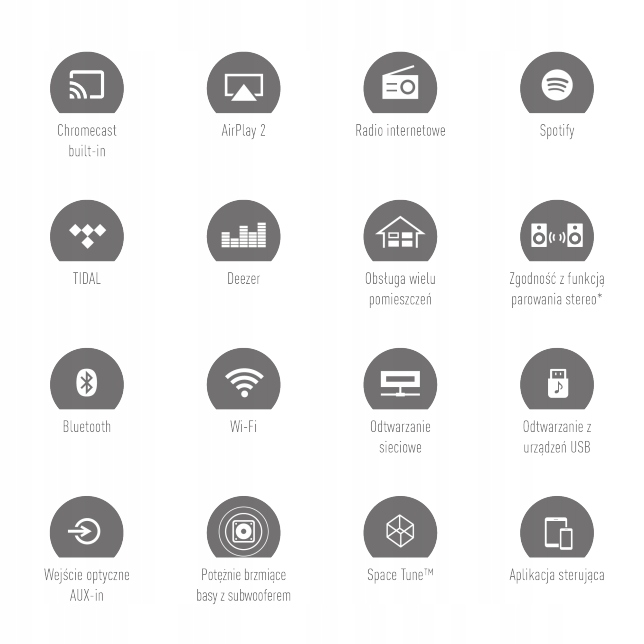 Oprócz odtwarzania z urządzeń USB oraz wejścia analogowego/optycznego, system OTTAVA™ S SC-C50 obsługuje następujące technologie i funkcje: Bluetooth®, AirPlay 2, wbudowana obsługa Chromecast, Spotify, Tidal, Deezer, radio internetowe i odtwarzanie przez sieć, co umożliwia wygodne odtwarzanie wielu różnych źródeł muzycznych przy użyciu jednego urządzenia. Zaawansowane opcje łączności obejmują także obsługę wielu pomieszczeń, parowanie* i sieć Wi-Fi, a także aplikacje sterujące do systemów iOS i Android.