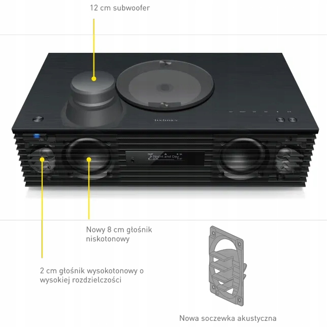 - Głośnik niskotonowy: 8 cm, stożkowy x 2 / wysokotonowy: 2 cm, kopułkowy x 2 / subwoofer: 12 cm, stożkowy