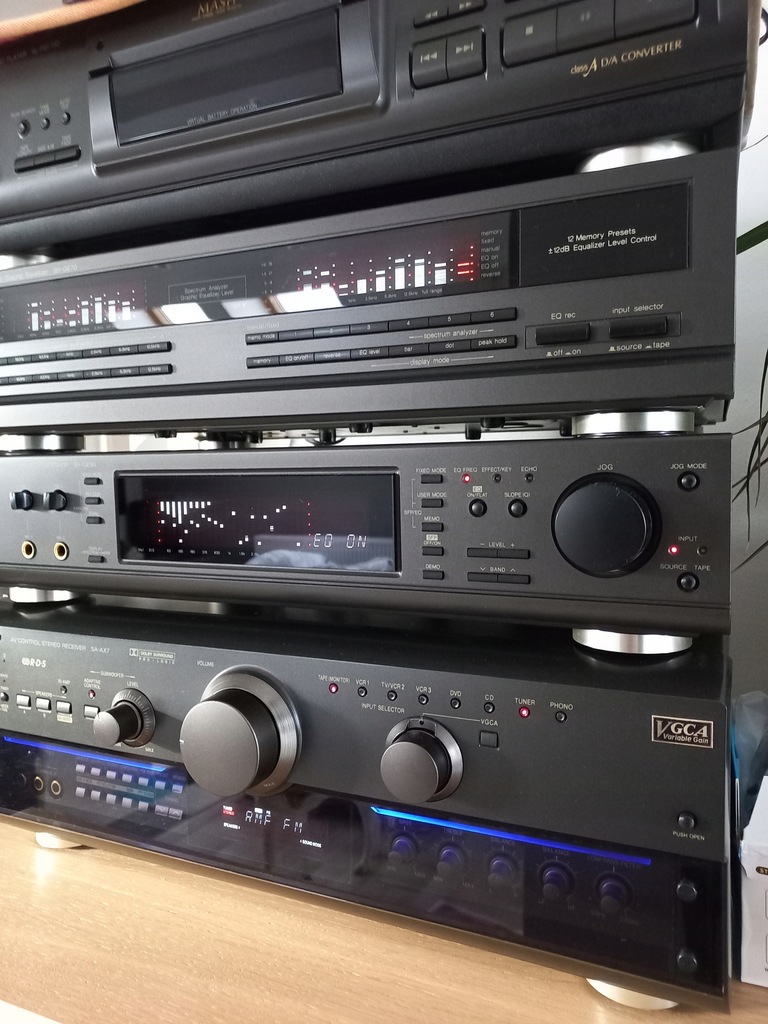 Technics Amplituner SA-AX7 w idealnym stanie technicznym. Optyczny stan przedniego panelu wraz z wyświetlaczem jak nowy. Bez rys i zniszczeń. Obudowa od góry nosi bardzo lekkie ślady używania. Pilot i kabel zasilający w zestawie. Sprzęt w stanie bardzo dobrym w moim użytkowaniu od ponad 10 lat. Inne elementy nie są przedmiotem tej aukcji.