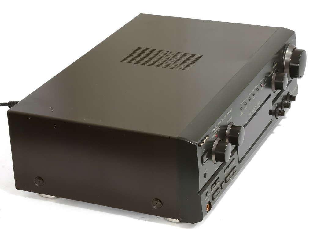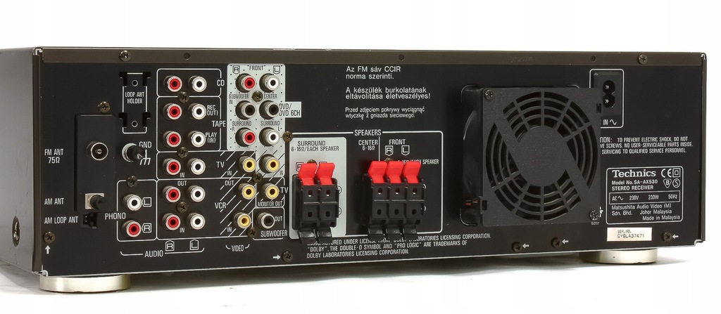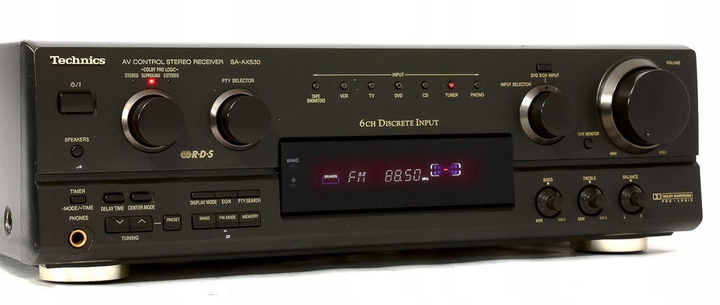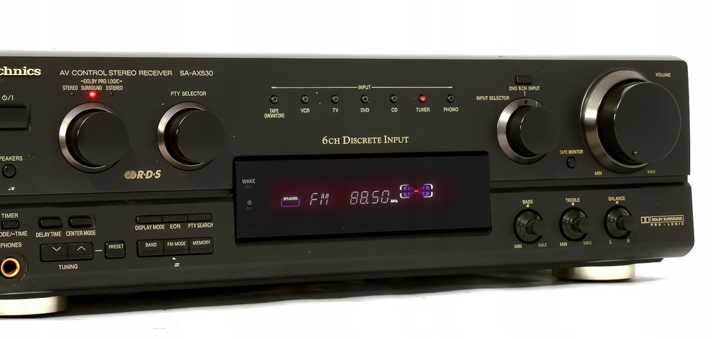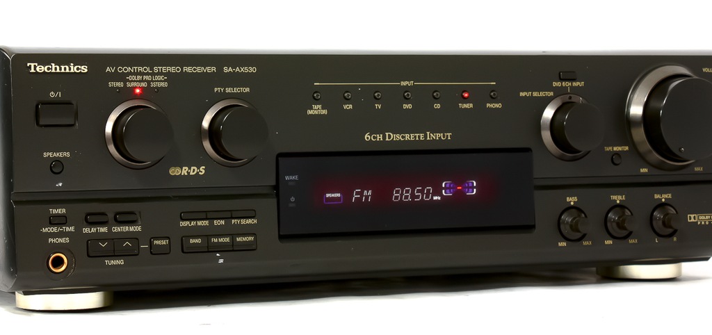 Technics SA-AX530 to wysoki model amplitunera pochodzący jednej z ostatnich serii firmy Technics. Seria SA-AX*30 to seria bardziej ceniona od nowszej linii SA-DX*50, nie tylko za lepszą jakość dźwięku, ale także za zastosowanie lepszych materiałów (SA-AX530 ma np. o wiele lepszą jakość panelu przedniego od tworzywa wykorzystywanego w serii SA-DX*50). Sprzęt samym wyglądem robi już spore wrażenie. Urządzenie posiada efektowny wygląd - czytelny wyświetlacz umieszczony centralnie i bardzo dobrze rozmieszczone pokrętła i przyciski. Sprzęt swoje waży, przede wszystkim za sprawą sporej wielkości transformatora. Pobór 230 W mocy przekłada się na imponujące wzmocnienie 5 X 60W/6 OHM DIN. Sprzęt charakteryzuje się świetną jakością dźwięku, co ciekawe ampli doskonale gra także w stereo, nie ustępując jakością wysokim modelom stereofonicznych wzmacniaczy / amplitunerów Technics'a. Dźwięk jest bogaty w szczegóły, z b. dobrymi średnimi tonami, jednak największym atutem jest bass, potrafiący zejść naprawdę bardzo nisko, a przy tym zachować kulturę. O ile oczywistą rzeczą jest fakt, że nie brakuje basu na wyjściu subwoofera, o tyle zaskakuje mocny w fotel bas, wydobywający się z kolumn frontowych (oczywiście w przypadku, gdy dysponujemy odpowiednimi głośnikami). Sprzęt został doskonale wysposażony - należy tu przede wszystkim wspomnieć o wbudowanym tunerze radiowym z pełnym systemem RDS, który doskonale spełnia swą rolę. Głowica FM jest bardzo czuła i odbiera sygnał w stereo już na kawałku kabla !!! Amplituner posiada dekodery dźwięku kina domowego 5.1 Dolby Pro Logic. Z tyłu widoczny pełen komplet wejść i wyjść. Istnieje możliwość regulacji trybu pracy kolumny centralnej, wybór z pośród wielu programów pola dźwiękowego i wiele innych funkcji. Urządzenie posiada pozłacane wyjście słuchawkowe. Jeśli szukasz porządnej podstawy do kina domowego i sprzętu, który jednocześnie sprawdzi się w stereo, to dobrze trafiłeś !!!