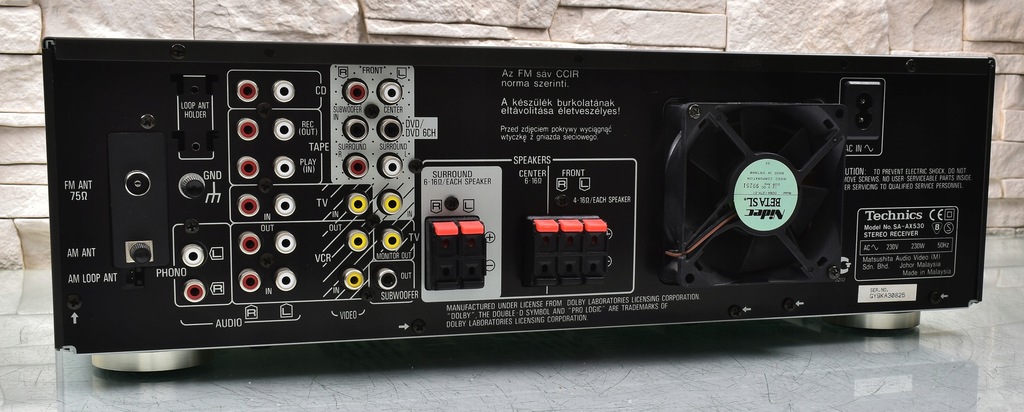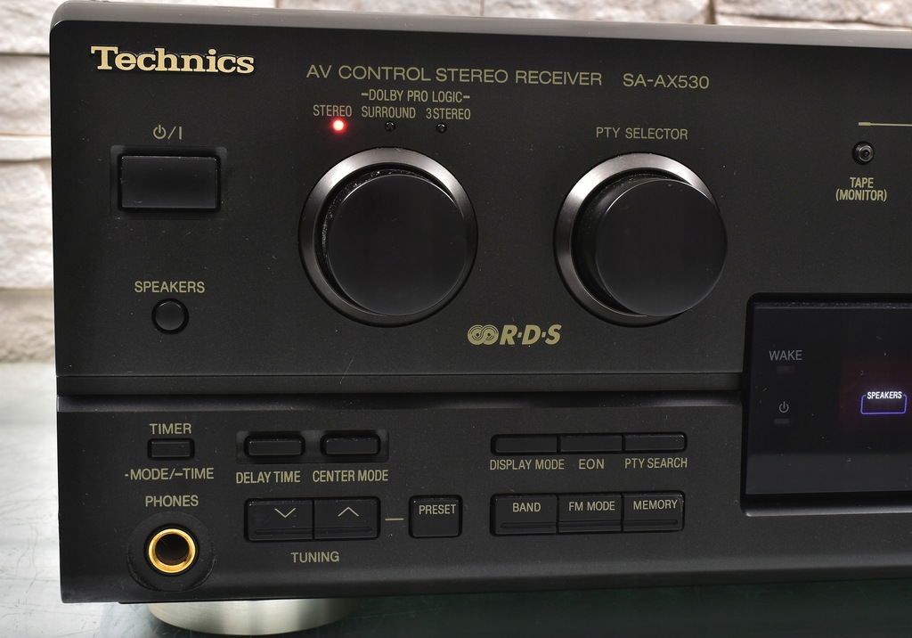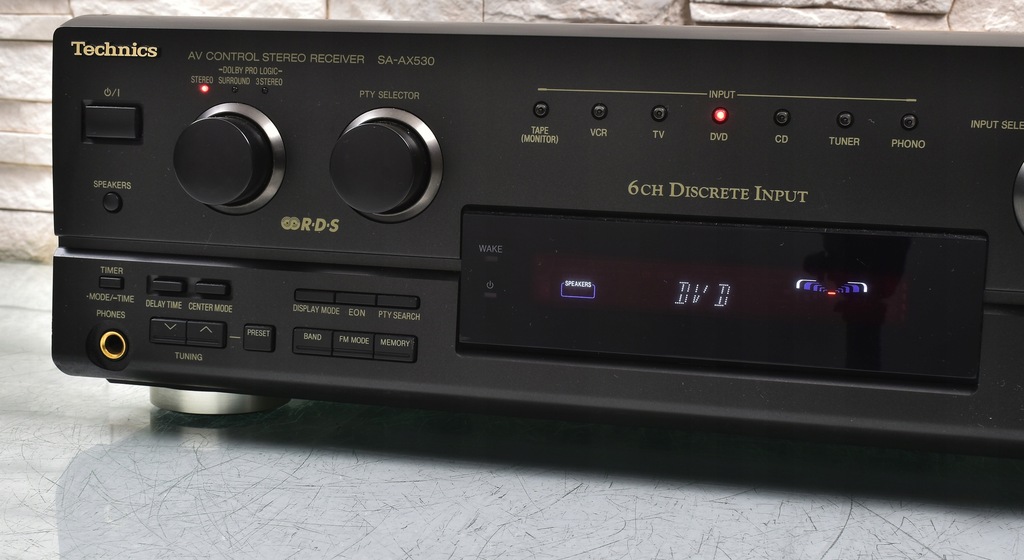 Technics SA-AX530 to wysoki model amplitunera pochodzący jednej z ostatnich serii firmy Technics. Seria SA-AX*30 to seria bardziej ceniona od nowszej linii SA-DX*50, nie tylko za lepszą jakość dźwięku, ale także za zastosowanie lepszych materiałów (SA-AX530 ma np. o wiele lepszą jakość panelu przedniego od tworzywa wykorzystywanego w serii SA-DX*50). Sprzęt samym wyglądem robi już spore wrażenie. Urządzenie posiada efektowny wygląd - czytelny wyświetlacz umieszczony centralnie i bardzo dobrze rozmieszczone pokrętła i przyciski. Sprzęt swoje waży, przede wszystkim za sprawą sporej wielkości transformatora. Pobór 230 W mocy przekłada się na imponujące wzmocnienie 5 X 60W/6 OHM DIN. Sprzęt charakteryzuje się świetną jakością dźwięku, co ciekawe ampli doskonale gra także w stereo, nie ustępując jakością wysokim modelom stereofonicznych wzmacniaczy / amplitunerów Technics'a. Dźwięk jest bogaty w szczegóły, z b. dobrymi średnimi tonami, jednak największym atutem jest bass, potrafiący zejść naprawdę bardzo nisko, a przy tym zachować kulturę. O ile oczywistą rzeczą jest fakt, że nie brakuje basu na wyjściu subwoofera, o tyle zaskakuje mocny w fotel bas, wydobywający się z kolumn frontowych (oczywiście w przypadku, gdy dysponujemy odpowiednimi głośnikami). Sprzęt został doskonale wysposażony - należy tu przede wszystkim wspomnieć o wbudowanym tunerze radiowym z pełnym systemem RDS, który doskonale spełnia swą rolę. Głowica FM jest bardzo czuła i odbiera sygnał w stereo już na kawałku kabla !!! Amplituner posiada dekodery dźwięku kina domowego 5.1 Dolby Pro Logic. Z tyłu widoczny pełen komplet wejść i wyjść. Istnieje możliwość regulacji trybu pracy kolumny centralnej, wybór z pośród wielu programów pola dźwiękowego i wiele innych funkcji. Urządzenie posiada pozłacane wyjście słuchawkowe. Jeśli szukasz porządnej podstawy do kina domowego i sprzętu, który jednocześnie sprawdzi się w stereo, to dobrze trafiłeś !!!