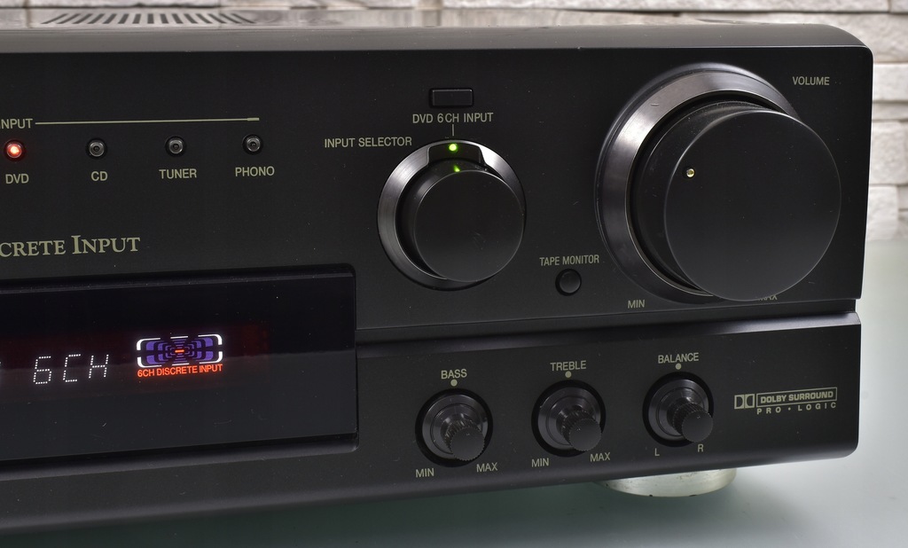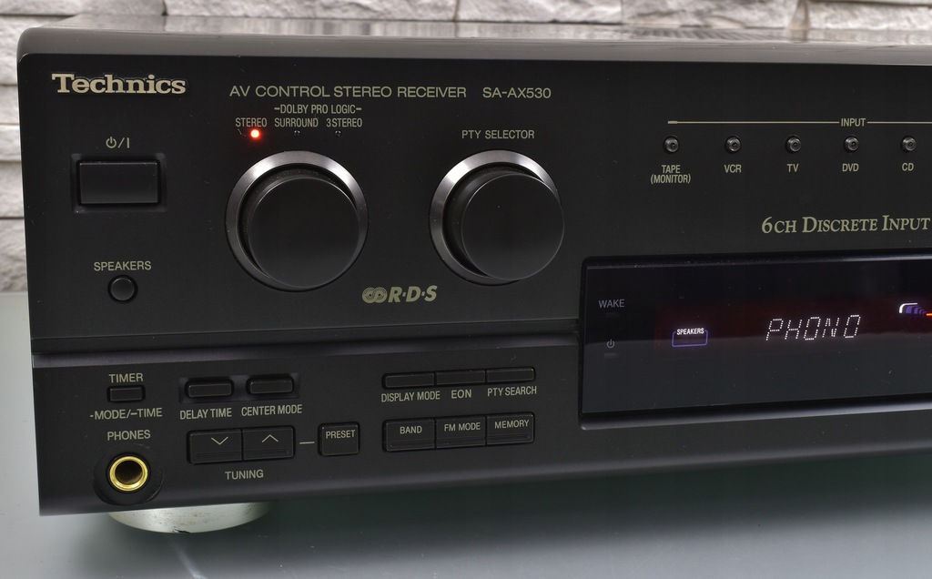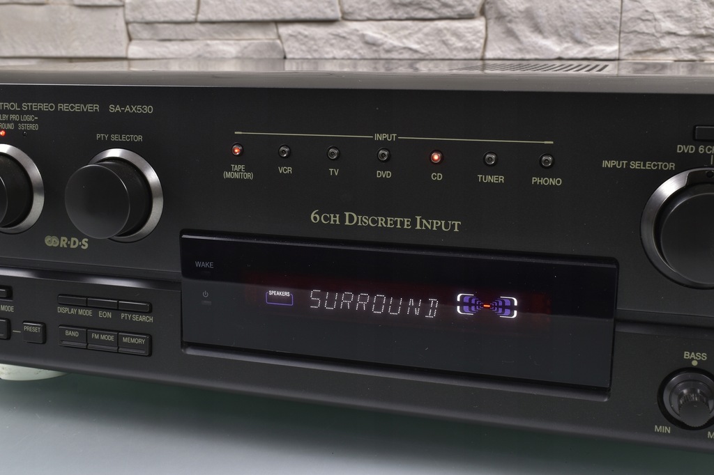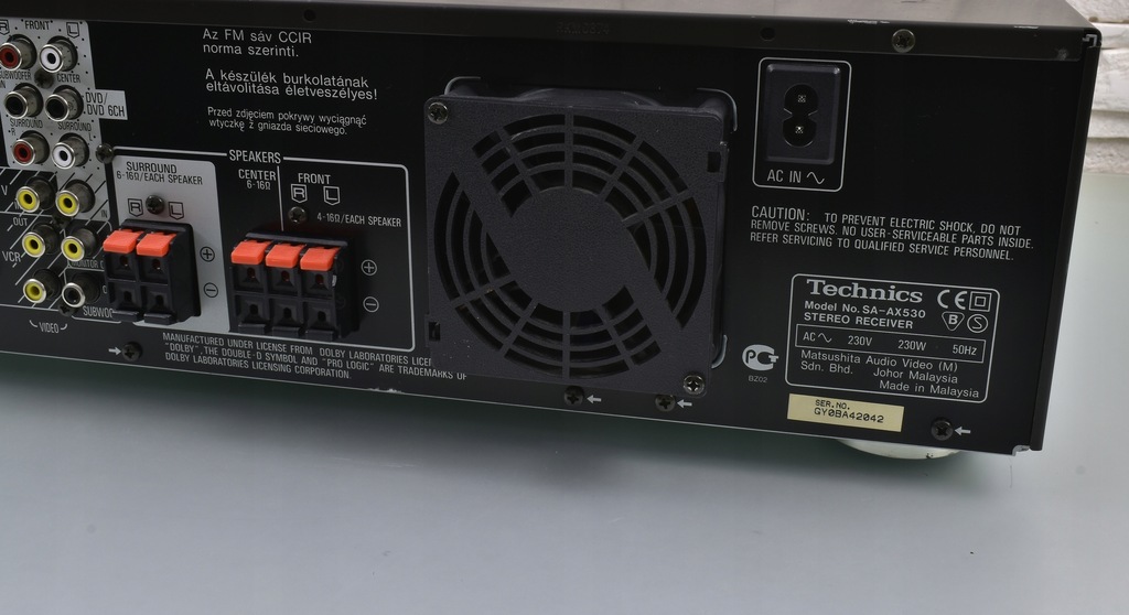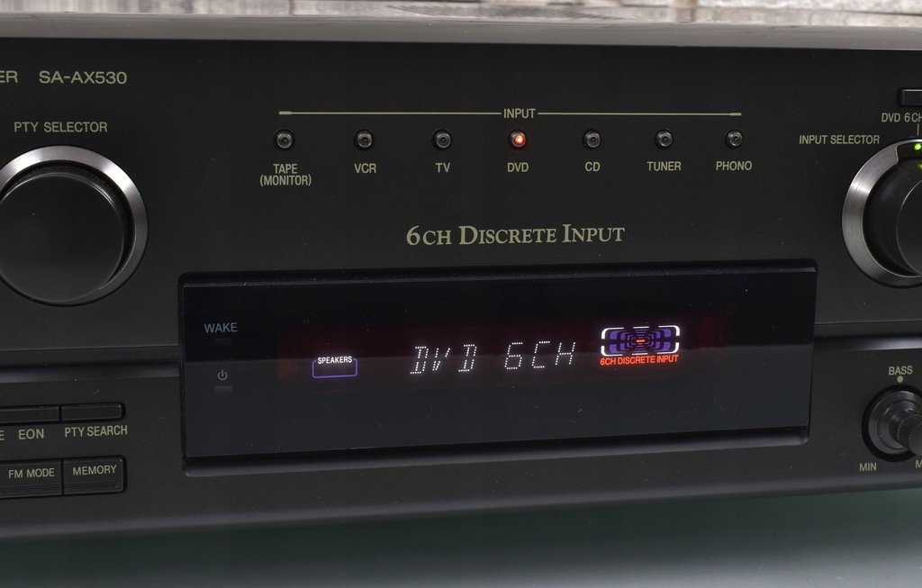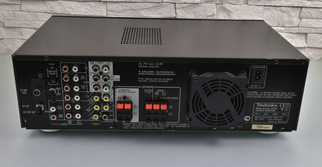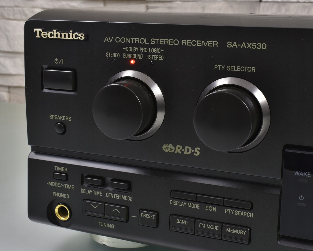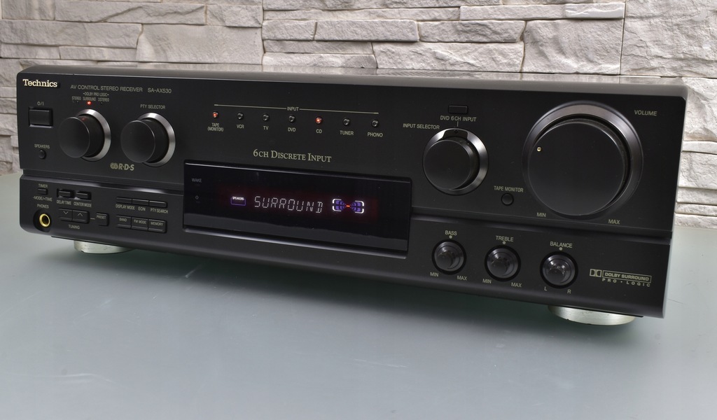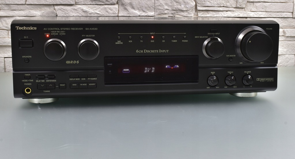 Technics SA-AX530 to wysoki model amplitunera pochodzący jednej z ostatnich serii firmy Technics. Seria SA-AX*30 to seria bardziej ceniona od nowszej linii SA-DX*50, nie tylko za lepszą jakość dźwięku, ale także za zastosowanie lepszych materiałów (SA-AX530 ma np. o wiele lepszą jakość panelu przedniego od tworzywa wykorzystywanego w serii SA-DX*50). Sprzęt samym wyglądem robi już spore wrażenie. Urządzenie posiada efektowny wygląd - czytelny wyświetlacz umieszczony centralnie i bardzo dobrze rozmieszczone pokrętła i przyciski. Sprzęt swoje waży, przede wszystkim za sprawą sporej wielkości transformatora. Pobór 230 W mocy przekłada się na imponujące wzmocnienie 5 X 60W/6 OHM DIN. Sprzęt charakteryzuje się świetną jakością dźwięku, co ciekawe ampli doskonale gra także w stereo, nie ustępując jakością wysokim modelom stereofonicznych wzmacniaczy / amplitunerów Technics'a. Dźwięk jest bogaty w szczegóły, z b. dobrymi średnimi tonami, jednak największym atutem jest bass, potrafiący zejść naprawdę bardzo nisko, a przy tym zachować kulturę. O ile oczywistą rzeczą jest fakt, że nie brakuje basu na wyjściu subwoofera, o tyle zaskakuje mocny w fotel bas, wydobywający się z kolumn frontowych (oczywiście w przypadku, gdy dysponujemy odpowiednimi głośnikami). Sprzęt został doskonale wysposażony - należy tu przede wszystkim wspomnieć o wbudowanym tunerze radiowym z pełnym systemem RDS, który doskonale spełnia swą rolę. Głowica FM jest bardzo czuła i odbiera sygnał w stereo już na kawałku kabla !!! Amplituner posiada dekodery dźwięku kina domowego 5.1 Dolby Pro Logic. Z tyłu widoczny pełen komplet wejść i wyjść. Istnieje możliwość regulacji trybu pracy kolumny centralnej, wybór z pośród wielu programów pola dźwiękowego i wiele innych funkcji. Urządzenie posiada pozłacane wyjście słuchawkowe. Jeśli szukasz porządnej podstawy do kina domowego i sprzętu, który jednocześnie sprawdzi się w stereo, to dobrze trafiłeś !!!