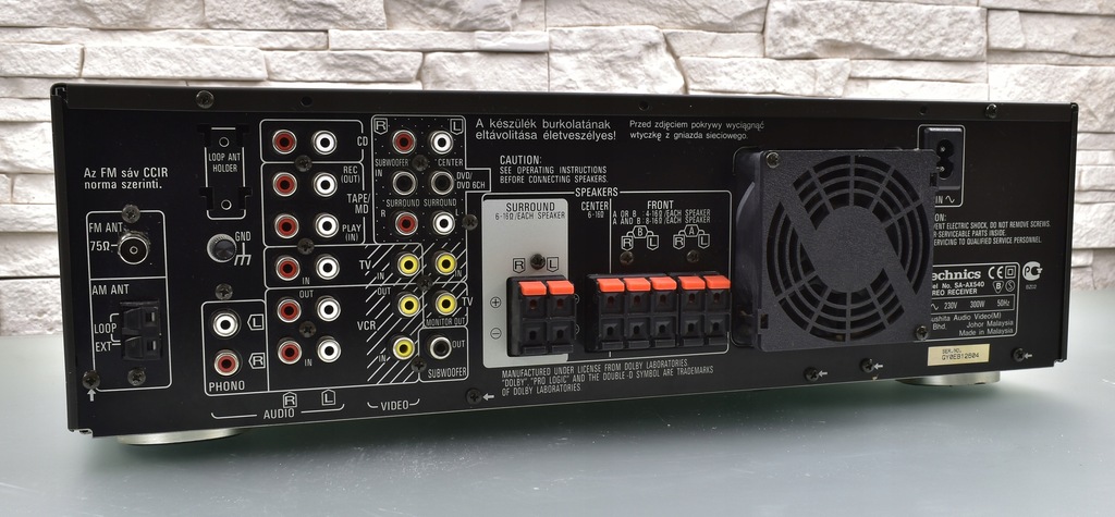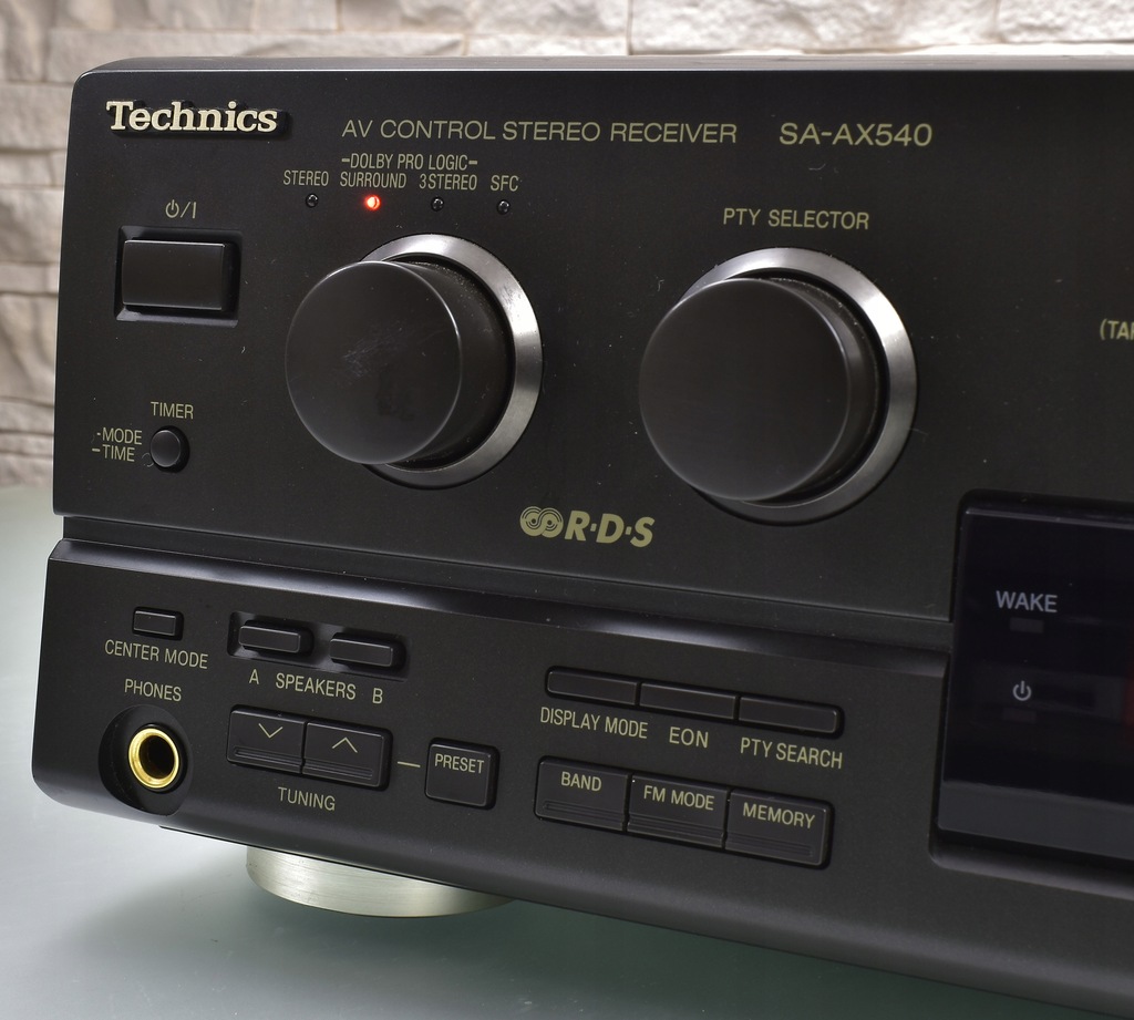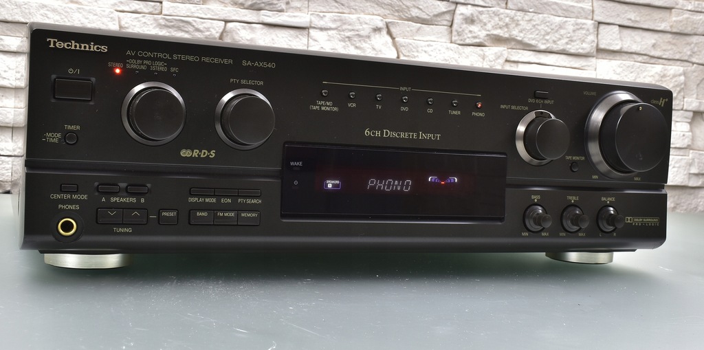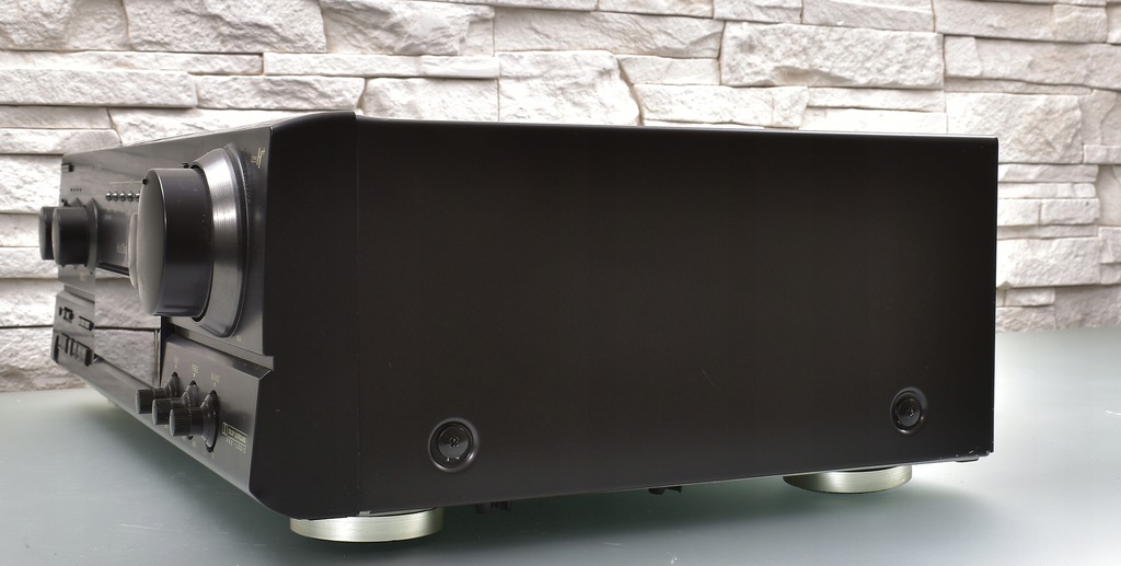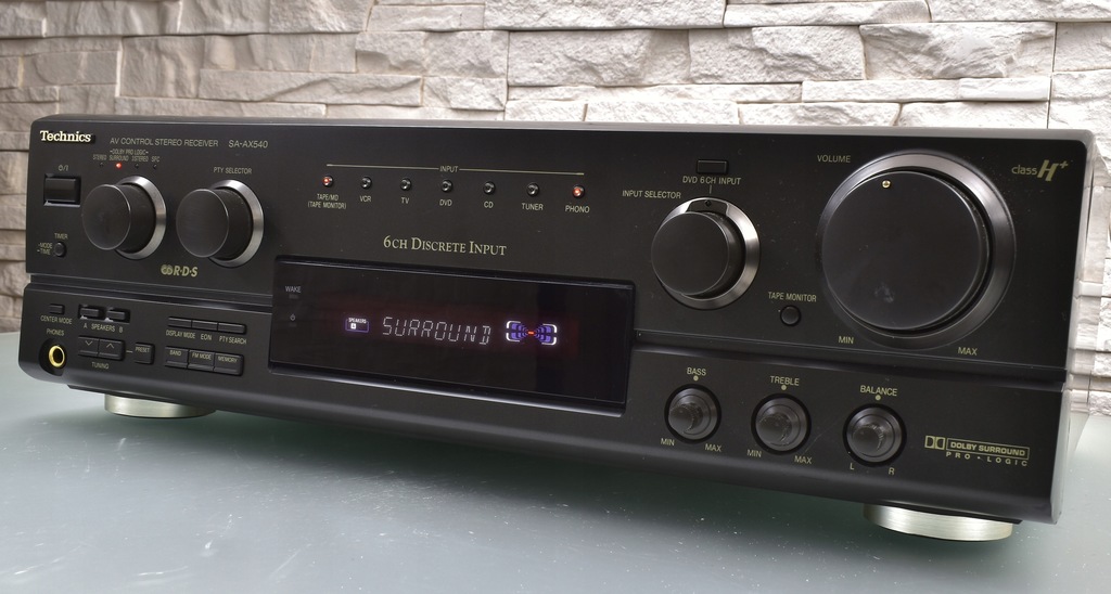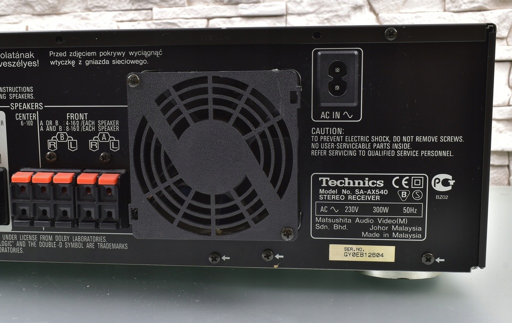 Technics SA-AX540 to wysoki model amplitunera pochodzący jednej z ostatnich serii firmy Technics. Seria SA-AX*40 to seria bardziej ceniona od nowszej linii SA-DX*50, nie tylko za lepszą jakość dźwięku, ale także za zastosowanie lepszych materiałów (SA-AX540 ma np. o wiele lepszą jakość panelu przedniego od tworzywa wykorzystywanego w serii SA-DX*50). Sprzęt samym wyglądem robi już spore wrażenie. Urządzenie posiada efektowny wygląd - czytelny wyświetlacz umieszczony centralnie i bardzo dobrze rozmieszczone pokrętła i przyciski. Sprzęt swoje waży, przede wszystkim za sprawą sporej wielkości transformatora. Pobór 230 W mocy przekłada się na imponujące wzmocnienie 5 X 60W/6 OHM DIN. Sprzęt charakteryzuje się świetną jakością dźwięku, co ciekawe ampli doskonale gra także w stereo, nie ustępując jakością wysokim modelom stereofonicznych wzmacniaczy / amplitunerów Technics'a. Dźwięk jest bogaty w szczegóły, z b. dobrymi średnimi tonami, jednak największym atutem jest bass, potrafiący zejść naprawdę bardzo nisko, a przy tym zachować kulturę. O ile oczywistą rzeczą jest fakt, że nie brakuje basu na wyjściu subwoofera, o tyle zaskakuje mocny w fotel bas, wydobywający się z kolumn frontowych (oczywiście w przypadku, gdy dysponujemy odpowiednimi głośnikami). Sprzęt został doskonale wysposażony - należy tu przede wszystkim wspomnieć o wbudowanym tunerze radiowym z pełnym systemem RDS, który doskonale spełnia swą rolę. Głowica FM jest bardzo czuła i odbiera sygnał w stereo już na kawałku kabla !!! Amplituner posiada dekodery dźwięku kina domowego 5.1 Dolby Pro Logic. Z tyłu widoczny pełen komplet wejść i wyjść. Istnieje możliwość regulacji trybu pracy kolumny centralnej, wybór z pośród wielu programów pola dźwiękowego i wiele innych funkcji. Urządzenie posiada pozłacane wyjście słuchawkowe. Jeśli szukasz porządnej podstawy do kina domowego i sprzętu, który jednocześnie sprawdzi się w stereo, to dobrze trafiłeś !!!