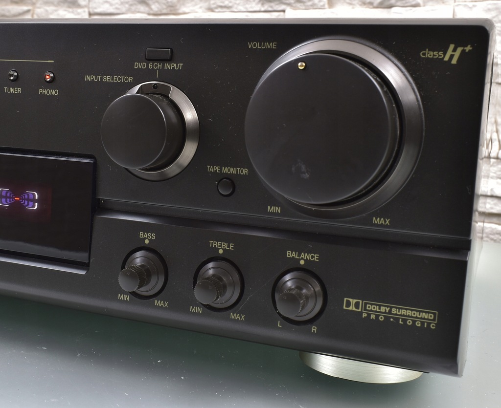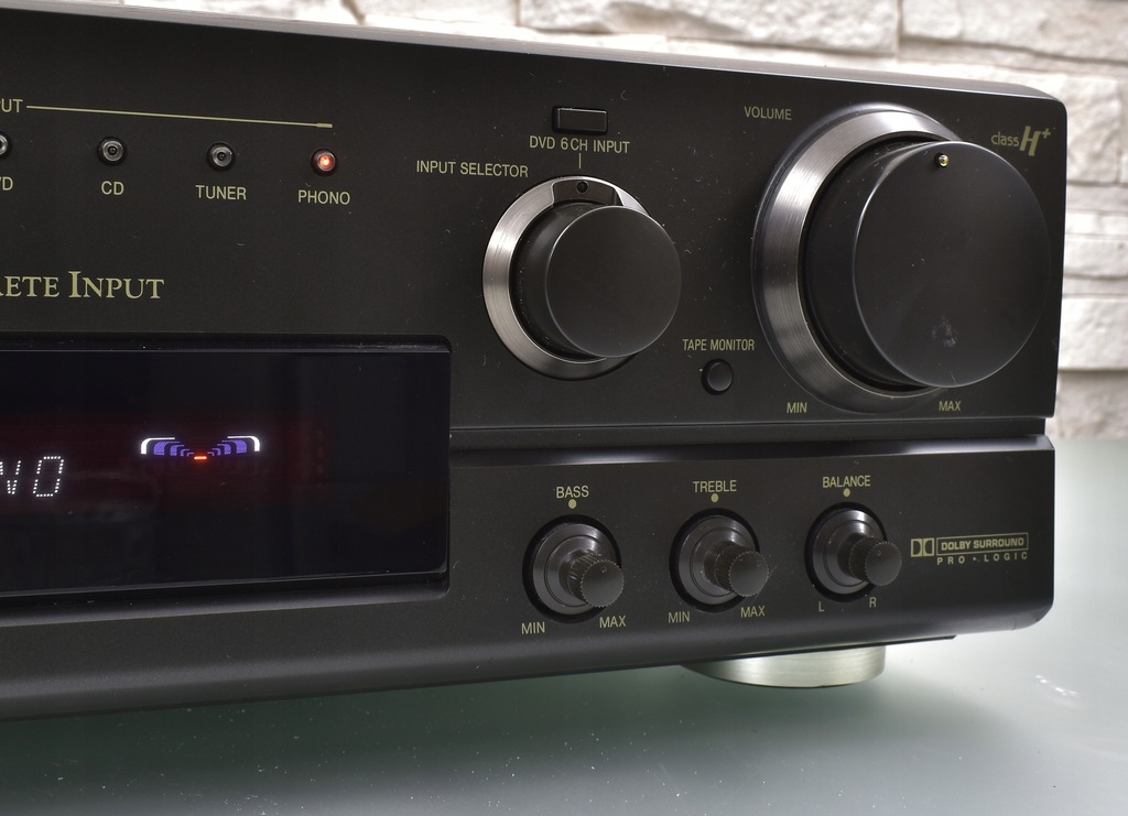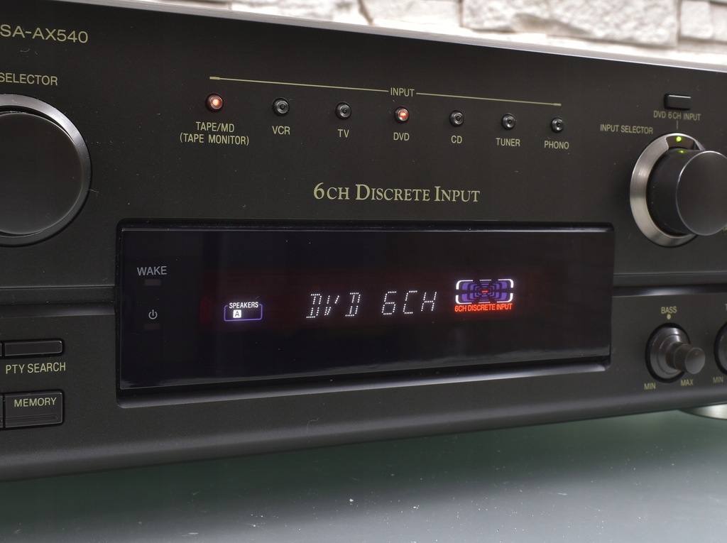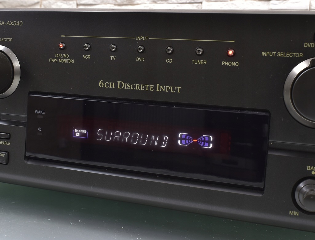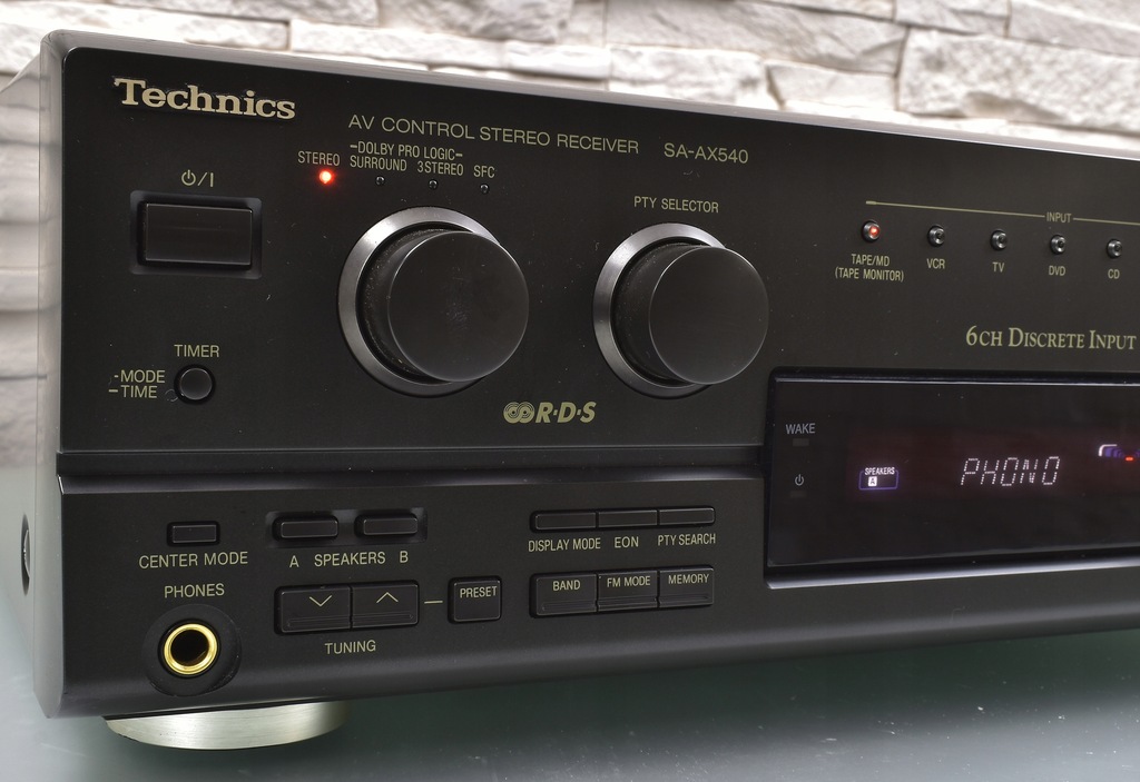 Technics SA-AX540 to wysoki model amplitunera pochodzący jednej z ostatnich serii firmy Technics. Seria SA-AX*40 to seria bardziej ceniona od nowszej linii SA-DX*50, nie tylko za lepszą jakość dźwięku, ale także za zastosowanie lepszych materiałów (SA-AX540 ma np. o wiele lepszą jakość panelu przedniego od tworzywa wykorzystywanego w serii SA-DX*50). Sprzęt samym wyglądem robi już spore wrażenie. Urządzenie posiada efektowny wygląd - czytelny wyświetlacz umieszczony centralnie i bardzo dobrze rozmieszczone pokrętła i przyciski. Sprzęt swoje waży, przede wszystkim za sprawą sporej wielkości transformatora. Pobór 230 W mocy przekłada się na imponujące wzmocnienie 5 X 60W/6 OHM DIN. Sprzęt charakteryzuje się świetną jakością dźwięku, co ciekawe ampli doskonale gra także w stereo, nie ustępując jakością wysokim modelom stereofonicznych wzmacniaczy / amplitunerów Technics'a. Dźwięk jest bogaty w szczegóły, z b. dobrymi średnimi tonami, jednak największym atutem jest bass, potrafiący zejść naprawdę bardzo nisko, a przy tym zachować kulturę. O ile oczywistą rzeczą jest fakt, że nie brakuje basu na wyjściu subwoofera, o tyle zaskakuje mocny w fotel bas, wydobywający się z kolumn frontowych (oczywiście w przypadku, gdy dysponujemy odpowiednimi głośnikami). Sprzęt został doskonale wysposażony - należy tu przede wszystkim wspomnieć o wbudowanym tunerze radiowym z pełnym systemem RDS, który doskonale spełnia swą rolę. Głowica FM jest bardzo czuła i odbiera sygnał w stereo już na kawałku kabla !!! Amplituner posiada dekodery dźwięku kina domowego 5.1 Dolby Pro Logic. Z tyłu widoczny pełen komplet wejść i wyjść. Istnieje możliwość regulacji trybu pracy kolumny centralnej, wybór z pośród wielu programów pola dźwiękowego i wiele innych funkcji. Urządzenie posiada pozłacane wyjście słuchawkowe. Jeśli szukasz porządnej podstawy do kina domowego i sprzętu, który jednocześnie sprawdzi się w stereo, to dobrze trafiłeś !!!