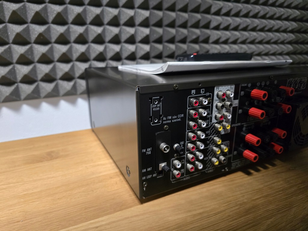 Dane techniczne: Moc wyjściowa: 6 x 100 watów Wzmacniacz klasy H+ Tryb testowy Możliwość wyboru głośnika A/B Tuner RDS z 30 miejscami w pamięci (RDS, EON, Radio Text) Wejścia: płyta DVD płyta CD Taśma Phono telewizja Wideo (Chinch, 3 S-Video) Oddzielne złącze dla pasywnego subwoofera Wyjścia audio: Gniazda głośnikowe w kablu surowym Funkcja adaptacyjnego sterowania umożliwiająca dodatkowe zwiększenie głośności basów. Bi-wiring do oddzielnego sterowania wysokiej jakości systemami głośnikowymi Wysokiej jakości złącza śrubowe dla wyjść głośnikowych Tryby pracy surround (Dolby surround, 3 stereo) Bardziej szczegółowe informacje na temat części wzmacniacza: Moc wyjściowa DIN 1 kHz (całkowite zniekształcenia harmoniczne 1%): 2 x 100 W Moc wyjściowa sygnału ciągłego przy 20 Hz-20 kHz (sterowanie obydwoma kanałami): 2 x 80 W Całkowity współczynnik harmoniczny: Moc znamionowa przy 20 Hz-20 kHz: 0,05% połowa mocy nominalnej przy 1 kHz: 0,03% Moc wyjściowa w trybie pracy Dolby Pro Logic DIN 1 kHz (współczynnik zniekształceń 1%): Głośniki przednie: 2 x 100 W Głośnik centralny: 100 W Głośniki surround: 2 x 100 W Subwoofer (f=100 Hz): 100 W Wymiary (szer. x wys. x gł.): 430 x 158 x 378,4 mm Waga: 11kg