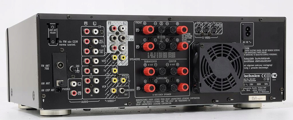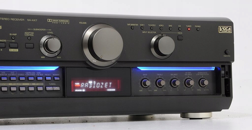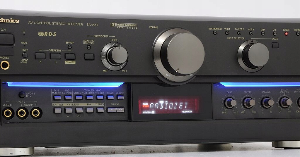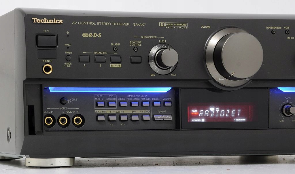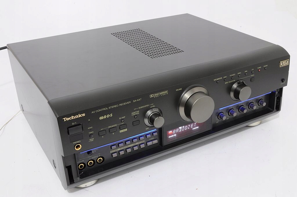 Technics SA-AX7 to świetny amplituner dużej mocy (ostatnia linia cenionego japońskiego producenta). Ma wbudowane dekoder Dolby ProLogic. Oprócz tego posiada kilka zdefiniowanych trybów pola dźwiękowego (Hall, Club, Live, Theater, Sim Surround). Model ten jest jedną z najpieknieszych konstrucji Technicsa. Jego design jest po prostu niesamowity. Efekt wizualny jest przepiękny dzięki niebieskiemu podświetlaniu. W ten sposób amplituner zwraca na siebie uwagę nawet laika. Skonstruowany jest na ogromnym ciężkim transformatorze i świetnych kondensatorach. Dzięki zastosowaniu wysokiej klasy komponentom sprzęt zapewnia niesamowicie mocny i czysty dźwięk. Szczególnie wyróżnia się bas który po wcisnięciu adaptive mode jest niesamowicie mocny i sprężysty . Największą zaletą tego amplitunera jest zastosowanie 6 końcówki mocy do subwoofera , której wzmocnienie jest oddzielnie regulowane. Pozwala to na podpięcie subwoofera pasywnego - znacznie tańszego. Cyfrowy tuner radiowy z RDS (możliwość zaprogramowania 30 stacji). Posiada funkcje timera (włączający i wyłączający.)