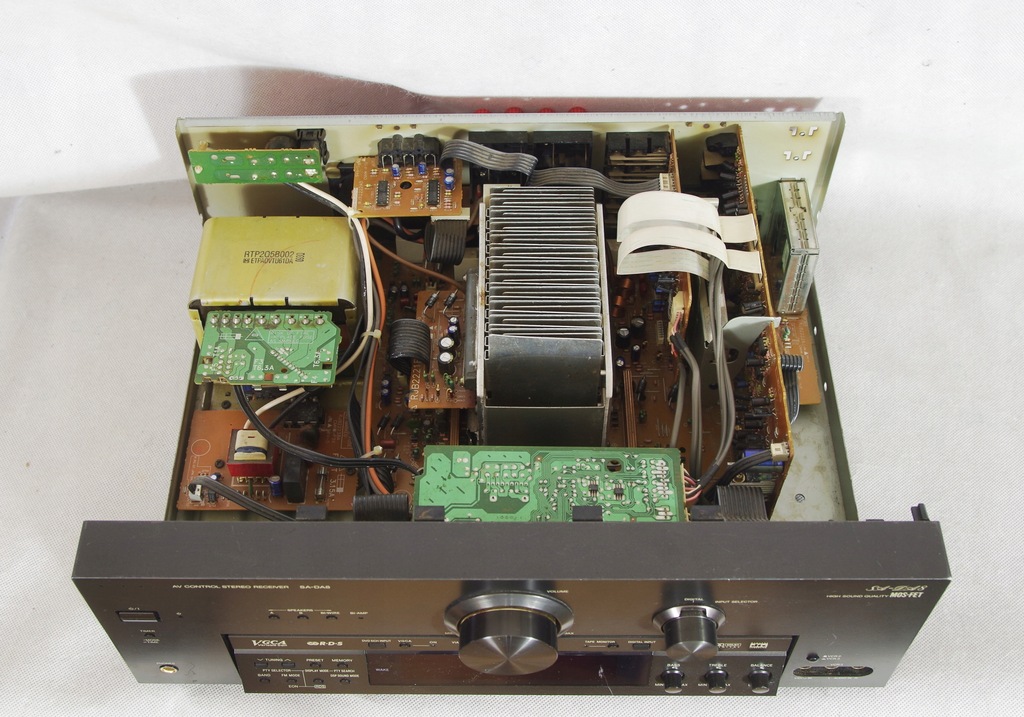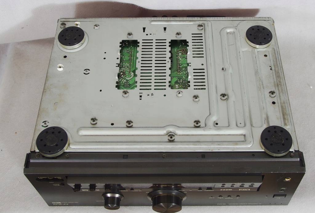 Amplituner po włączeniu wyświetla "OVERLOAD", prawdopodobnie uszkodzona jedna końcówka mocy, widać ślady po lutowaniu, sprzedaję, jako uszkodzony.