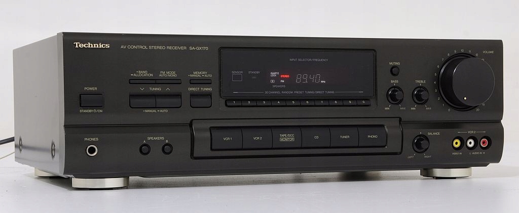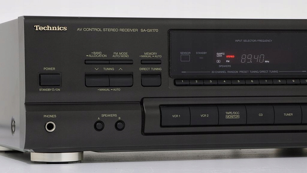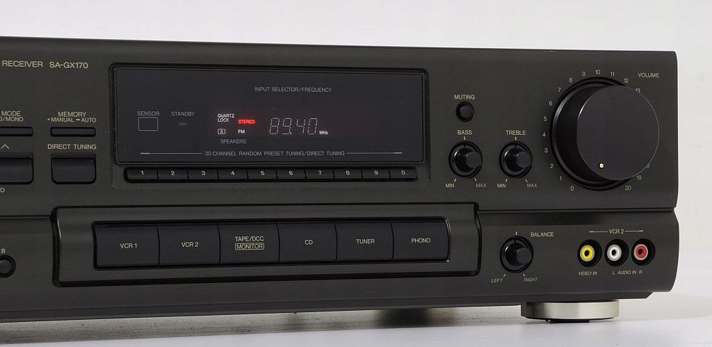- Przełączniki źródeł dźwięku (Tuner, Phono, CD, Tape Monitor/VCR2, VCR1)