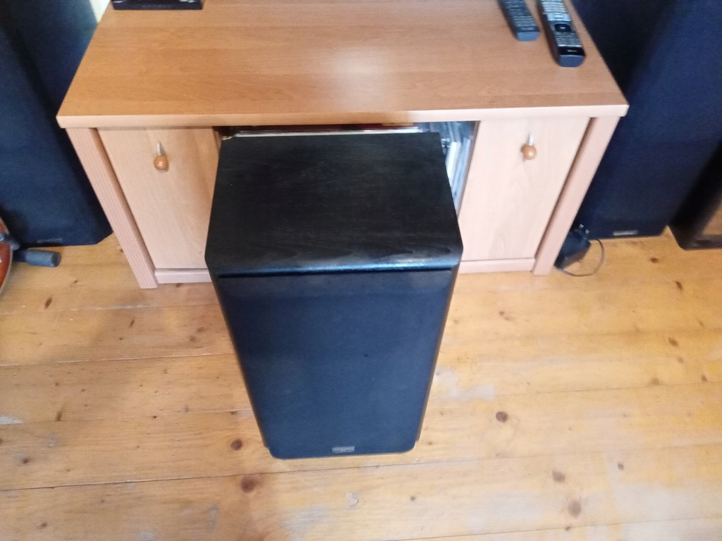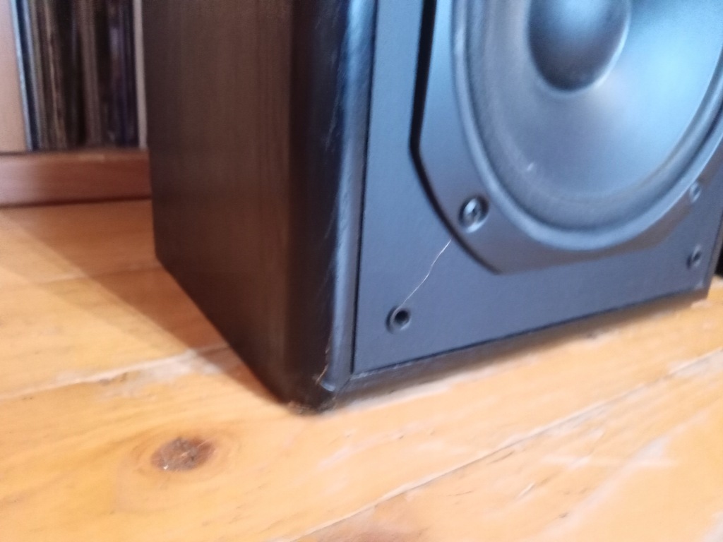 Jedna kolumna głośnikowa TECHNICS SB-CS95. Moc RMS 100W impedancja 8 ohm. Wszystkie głośniki działają dobrze. Obudowa jest trochę sfatygowana. Dolny lewy narożnik zgnieciony i małe pęknięcie płyty czołowej w tej okolicy. Wykruszenia, zadrapania, przytarcia itp. Mała dziurka w maskownicy. Wymiary 53 x 28,5 x 24 cm.