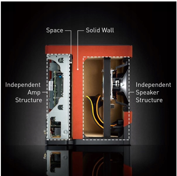 Wzmacniacz i obudowy głośników mają oddzielne konstrukcje i odstępy, co minimalizuje wibracje przenoszone na wzmacniacz i pozwala uzyskać czysty dźwięk.