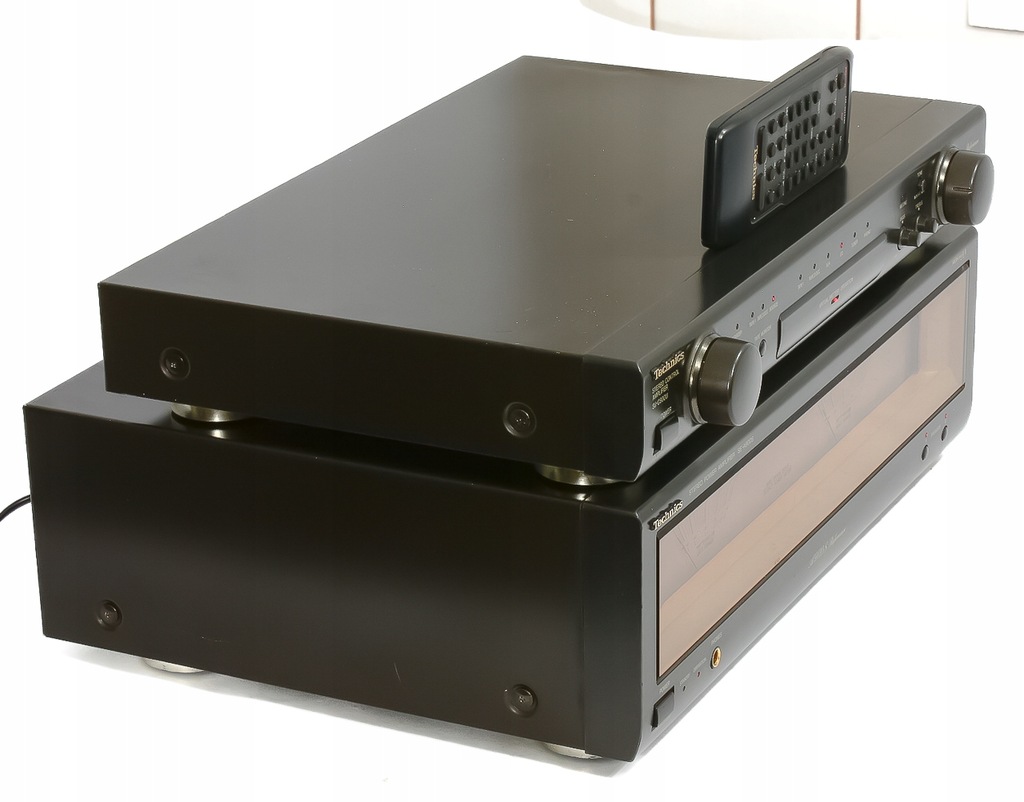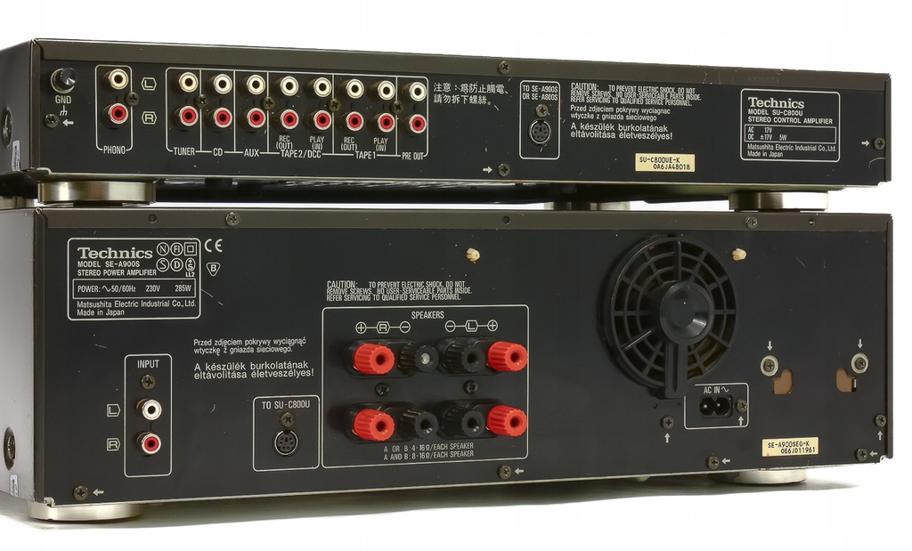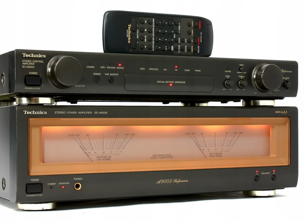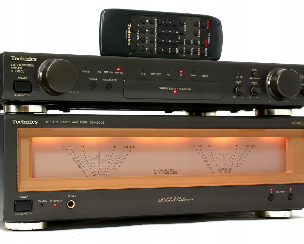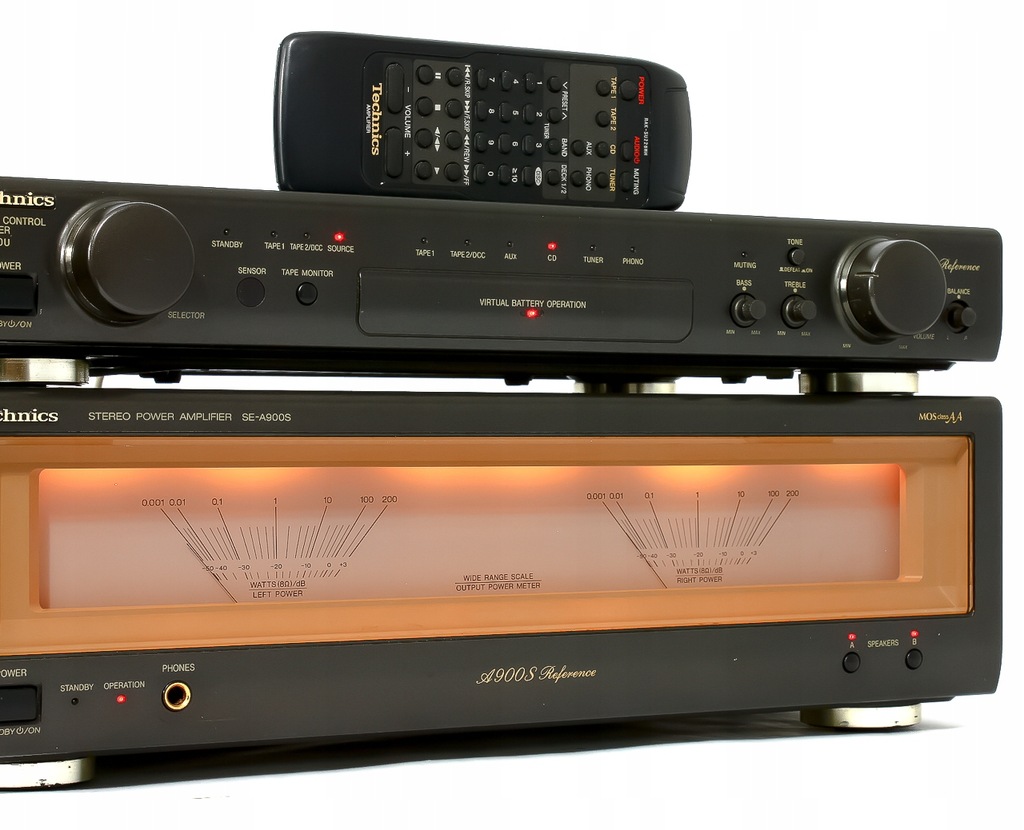 Przedmiotem sprzedaży jest najwyższy model wzmacniacza dzielonego tej serii Technics'a. Sprzęt został wyprodukowany w Japonii, co gwarantuje zastosowanie najlepszych podzespołów audio. W końcówce kryje się ogromne, ciężkie trafo oraz sporej pojemności firmowe kondensatory filtrujące (2 x 6800 uFarradów). Power amp pobiera z sieci niemal 300W mocy, co przekłada się na PRAWDZIWE 120 Watt na kanał przy obciążeniu 4ohm (1 kHz). Warto dodać, że prezentowana wartość jest faktyczną mocą wyjściową (to bardzo ważne - obecnie producenci chińskiego audiobubla zawyżają moce do kosmicznych liczb w celach marketingowych). Z powyższej liczby nietrudno wywnioskować, że mamy do czynienia mocą, którą napędzić można dosłownie każdy zestaw kolumnowy. Dźwięk SU-A900D przewyższa brzmienie znane z najwyższych modeli zintegrowanych jak np SU-A900. Charakterystyka brzmienia z dobrą, przestrzenną stereofonią, b. czytelną lokalizacją instrumentów (jak na ten przedział cenowy) i sporą dawką szczegółów. Na uwagę zasługuje niesamowicie mocny, ale przy tym głęboki i nie męcząco-dudniący bass. Wszystko opiera się na dobrej średnicy spójnej z dość wyraźną, acz nieprzesadzoną górą. Przedwzmacniacz zestawu został wyposażony w układ Virtual Battery, zapewniający redukcję szumów pochodzących z zasilania. Wzmacniacz posiada komplet wejść, pokrętła korekcyjne oraz pozłacane wyjście słuchawkowe. Od strony wizualnej, sprzęt bardzo ładnie się prezentuje - podświetlane wskazówkowe zegary tworzą wyjątkowy i niepowtarzalny design - świetny efekt w ciemnym pomieszczeniu. Jeśli poszukujesz b. wysokiego modelu Technics'a i pragniesz mocnych wrażeń dźwiękowych, to jest to sprzęt dla Ciebie !!!