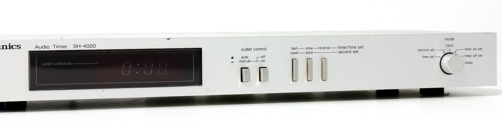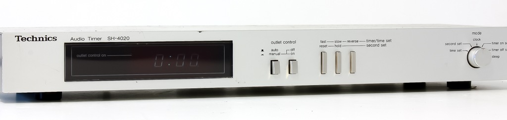 TIMER AUDIO TECHNICS model SH-4020 z pierwszej połowy lat 80-tych. Bardzo rzadko spotykany i poszukiwany, pozwalający na podłączenie do 4 zewnętrznych urządzeń np. wzmacniacza, tunera, korektora, odtwarzacza CD. Po ustawieniu zegara można zaprogramować godzinę włączenia i po naciśnięciu opcji AUTO nastąpi włączenie i wyłączenie podpiętych urządzeń o określonych godzinach. Dzięki temu można np. używać swojego zestawu HI-FI jako budzika który np. włączy nam o określonej godzinie ulubioną stację radiową, do tego TIMER służy też jako poczwórny rozgałęźnik.Zamiast natarczywego dźwięku budzika może nas obudzić miły głos prezentera radiowego. Zapraszam do zakupu!
