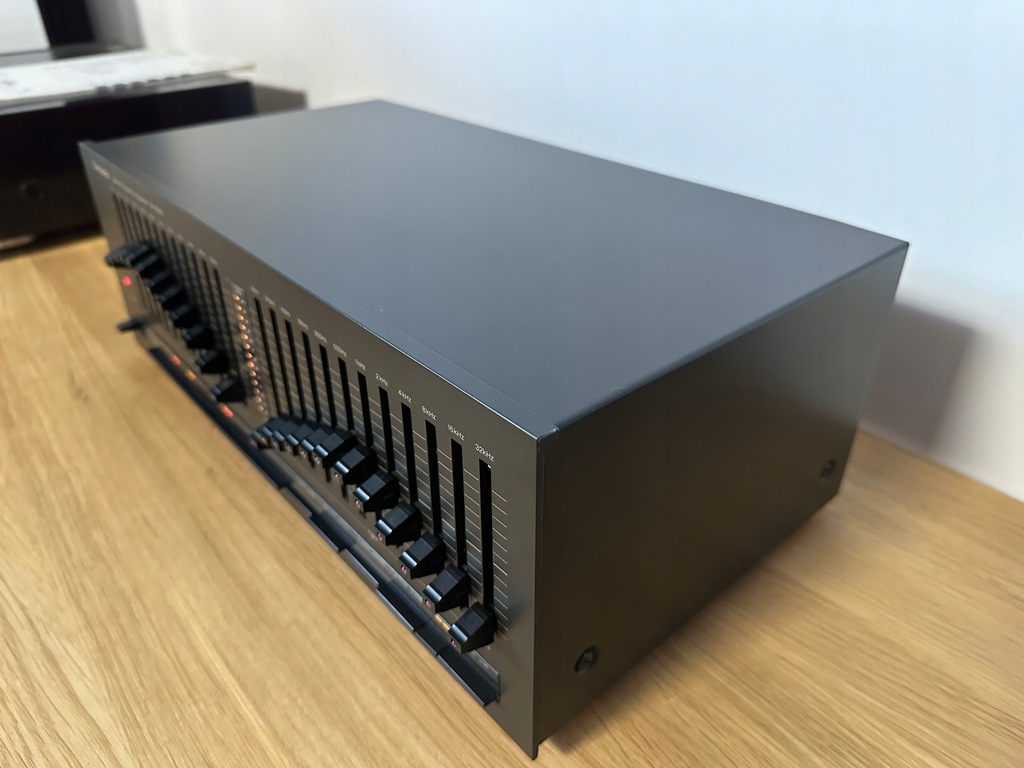 Technics Model: SH-8020 Typ: Korektor Lata budowy: 1980 - 1983 Wykonane w Japonii Kolor: srebrny, czarny Pilot zdalnego sterowania: nie Pobór mocy: 15W Wymiary: 430 x 153 x 244 mm (szer. x wys. x gł.) Waga: 6kg Nowa cena ok.: 650 DM znajomości Liczba wejść: Przełącznik sygnału wejściowego: 1 V, 47 kOhm, maks. 6 V. Liczba wyjść: Wyjście: 1 V, 600 omów, maks. 6 V. Dane techniczne Regulowane pasma częstotliwości: 16 Hz, 31,5 Hz, 63 Hz, 125 Hz, 250 Hz, 500 Hz, 1 kHz, 2 kHz, 4 kHz, 8 kHz, 16 kHz, 32 kHz Zakres regulacji: ± 12 dB, ± 3 dB (ciągle) Pasmo przenoszenia: 5 - 100 000 Hz (-1 dB) Nominalne zniekształcenia harmoniczne: 0,01% (20 Hz - 20 kHz) Współczynnik szumu: 100 dB (110 dB, IHF, A) Zysk: +- 1dB Balans kanałów 250 Hz - 6300 Hz: +- 0,5 dB Separacja kanałów 1 kHz: 55 dB Kontroler odpowiedzi częstotliwościowej: 2x 12 Specjalny sprzęt 2x 12 suwaków