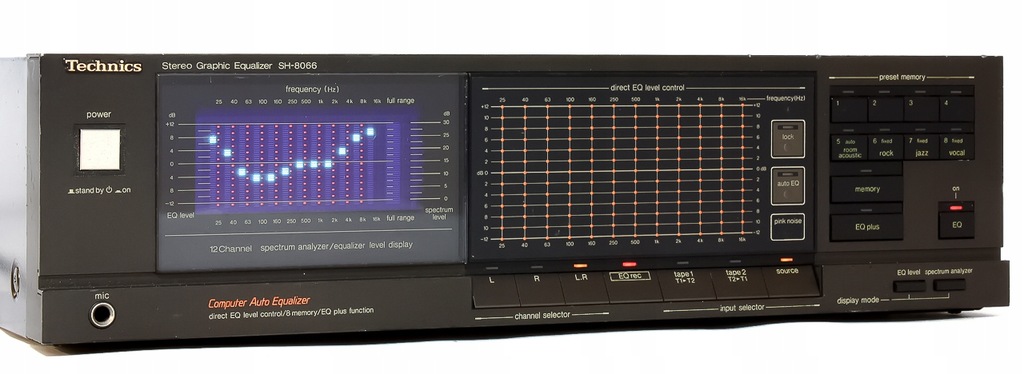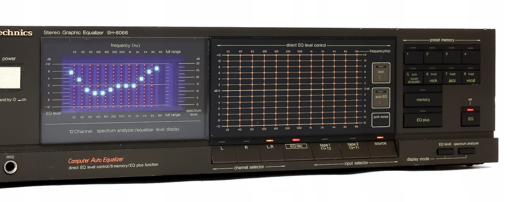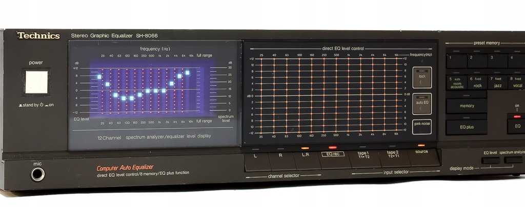 Jest to najwyższy model, cyfrowy Technicsa, ma bardzo ładny design, oraz mnóstwo funkcji, bardzo ładnie uwypukla tony wysokie oraz niskie, posiada regulację każdego z kanałów osobno bądź razem (w zależności od wybranej opcji) czym przewyższa model SH-GE70!! SH-8066 jest bardzo udanym modelem o czym świadczy ich wieloletnia bezawaryjność a ponadto tak jak napisałem powyżej częstotliwości niskie i wysokie są skutecznie podbite co jest słyszalne natychmiast po załączeniu korekcji Regulacja wybranej częstotliwości odbywa się cyfrowo, za pomocą panela dotykowego, obsługa takiego panela to czysta przyjemność i świetna zabawa, podczas przesuwania palca po panelu na wyświetlaczu jest podgląd pozycji w postaci rozjaśniającego się słupka. Korektor posiada pamięć 4 własnych ustawień, posiada możliwość podłączenia urządzeń do gniazd Line oraz Tape (m.in. do nagrywania na decku przetworzonego dźwięku lub do podłączenia dodatkowego segmentu). Wyświetlacz świeci na jasnoniebiesko, (świeci jasno i wyraźnie) co daje doskonały efekt w ciemnościach. Zapraszam do zakupu!