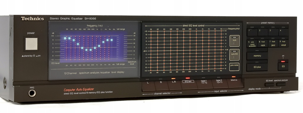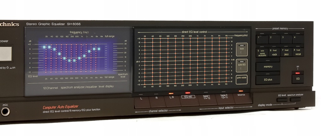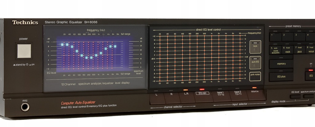 Jest to najwyższy model, cyfrowy Technicsa, ma bardzo ładny design, oraz mnóstwo funkcji, bardzo ładnie uwypukla tony wysokie oraz niskie, posiada regulację każdego z kanałów osobno bądź razem (w zależności od wybranej opcji) czym przewyższa model SH-GE70!! SH-8066 jest bardzo udanym modelem o czym świadczy ich wieloletnia bezawaryjność a ponadto tak jak napisałem powyżej częstotliwości niskie i wysokie są skutecznie podbite co jest słyszalne natychmiast po załączeniu korekcji Regulacja wybranej częstotliwości odbywa się cyfrowo, za pomocą panela dotykowego, obsługa takiego panela to czysta przyjemność i świetna zabawa, podczas przesuwania palca po panelu na wyświetlaczu jest podgląd pozycji w postaci rozjaśniającego się słupka. Korektor posiada pamięć 4 własnych ustawień, posiada możliwość podłączenia urządzeń do gniazd Line oraz Tape (m.in. do nagrywania na decku przetworzonego dźwięku lub do podłączenia dodatkowego segmentu). Wyświetlacz świeci na jasnoniebiesko, (świeci jasno i wyraźnie) co daje doskonały efekt w ciemnościach. Zapraszam do zakupu!
