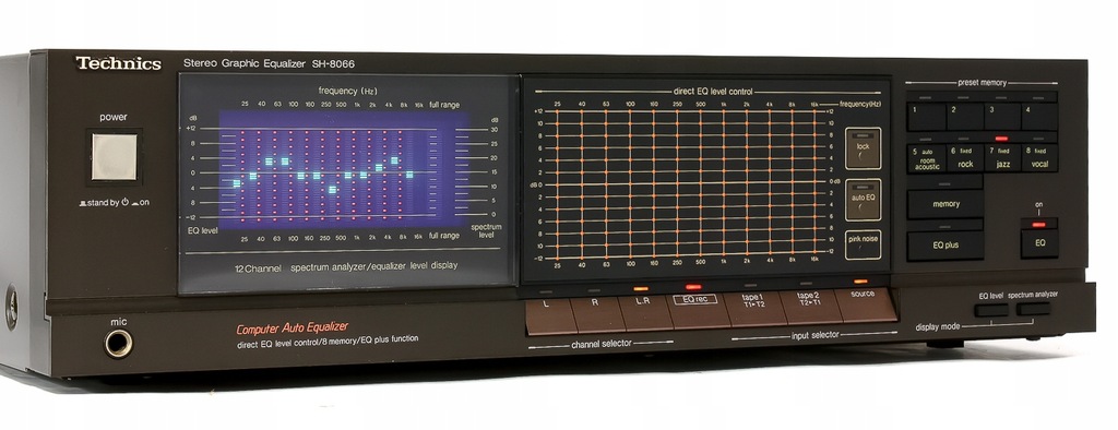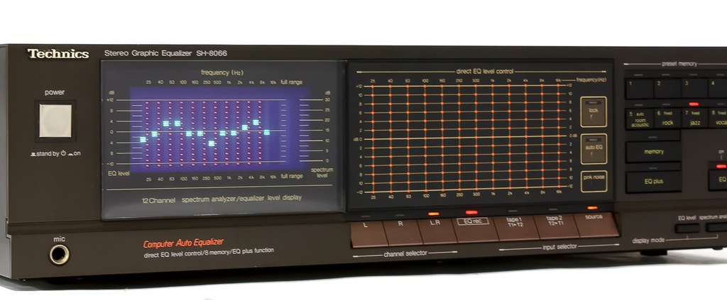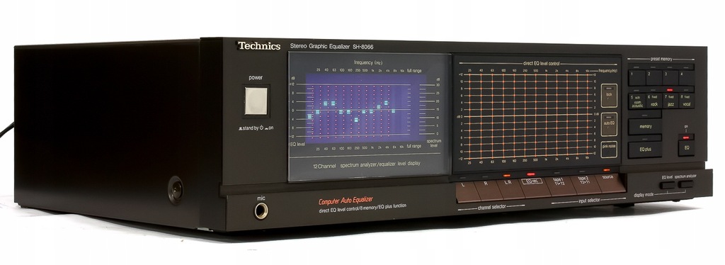 Jest to najwyższy model, cyfrowy Technicsa, ma bardzo ładny design, oraz mnóstwo funkcji, bardzo ładnie uwypukla tony wysokie oraz niskie, posiada regulację każdego z kanałów osobno bądź razem (w zależności od wybranej opcji) czym przewyższa model SH-GE70!! SH-8066 jest bardzo udanym modelem o czym świadczy ich wieloletnia bezawaryjność a ponadto tak jak napisałem powyżej częstotliwości niskie i wysokie są skutecznie podbite co jest słyszalne natychmiast po załączeniu korekcji Regulacja wybranej częstotliwości odbywa się cyfrowo, za pomocą panela dotykowego, obsługa takiego panela to czysta przyjemność i świetna zabawa, podczas przesuwania palca po panelu na wyświetlaczu jest podgląd pozycji w postaci rozjaśniającego się słupka. Korektor posiada pamięć 4 własnych ustawień, posiada możliwość podłączenia urządzeń do gniazd Line oraz Tape (m.in. do nagrywania na decku przetworzonego dźwięku lub do podłączenia dodatkowego segmentu). Wyświetlacz świeci na jasnoniebiesko, (świeci jasno i wyraźnie) co daje doskonały efekt w ciemnościach. Zapraszam do zakupu!