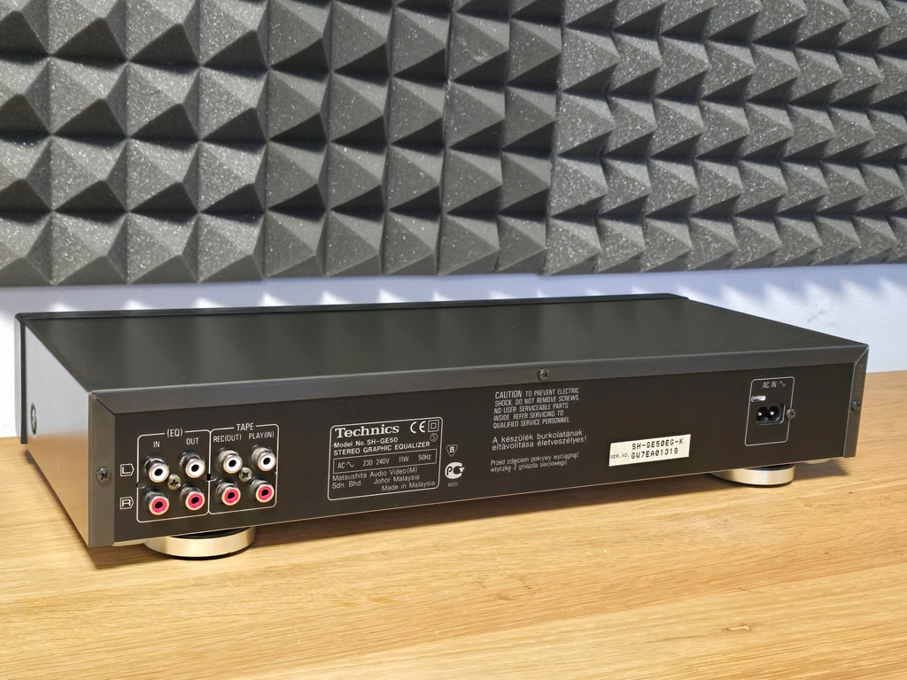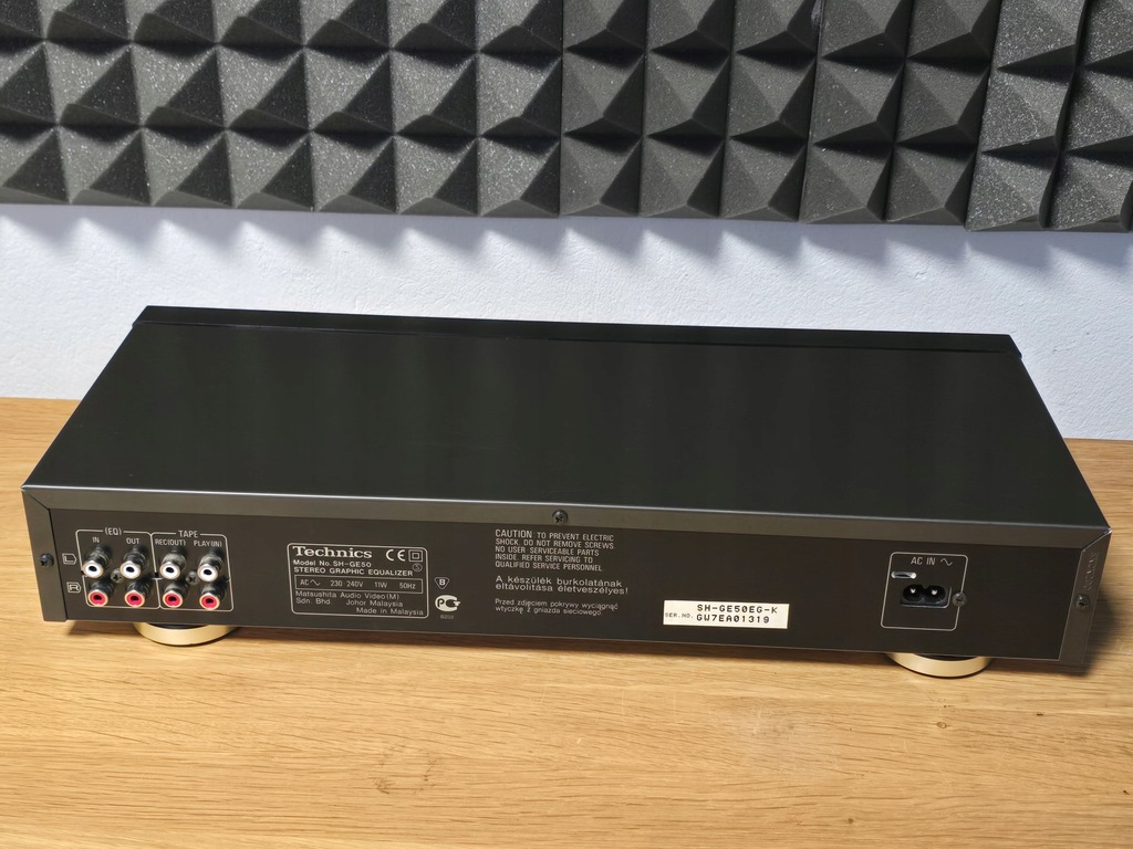 Technics Model: SH-GE 50 Typ: Korektor Lata budowy: 1997 - 2001 Wyprodukowano w: Japonii Kolor: czarny Technics Pobór mocy: 11W Wymiary: 430 x 80,4 x 192,5 mm (szer. x wys. x gł.) Waga: 1,8 kg Nowa cena ok.: 299 DM Znajomości Liczba wejść: Przełącznik sygnału wejściowego: 150mV/1V, 47kOhm Liczba wyjść: Wyjście: 1 V, 600 omów, maksymalnie 8 V (1 KHz, THD 0,01% Dane techniczne Pasmo przenoszenia: 5 - 100 000 Hz Współczynnik zniekształceń: 0,007% przy 20-20 kHz 0,005% przy 1 kHz Stosunek sygnału do szumu: 110 dB (IHF'A) Wejście: maks. 6,0 V Czułość wejściowa: 1,0 V Impedancja wejściowa: 33 kOhm 2x 7 kanałów: 63 Hz, 160 Hz, 400 Hz, 1 kHz, 2,5 kHz, 6,3 kHz, 16 kHz Zakres regulacji: ± 12 dB