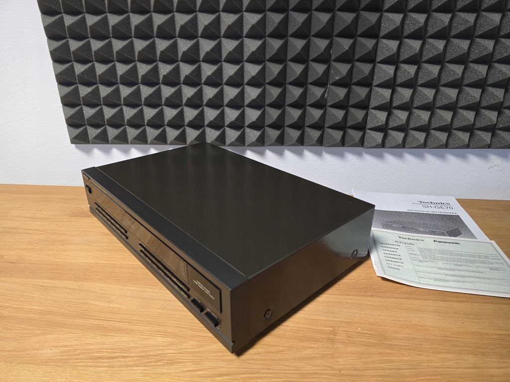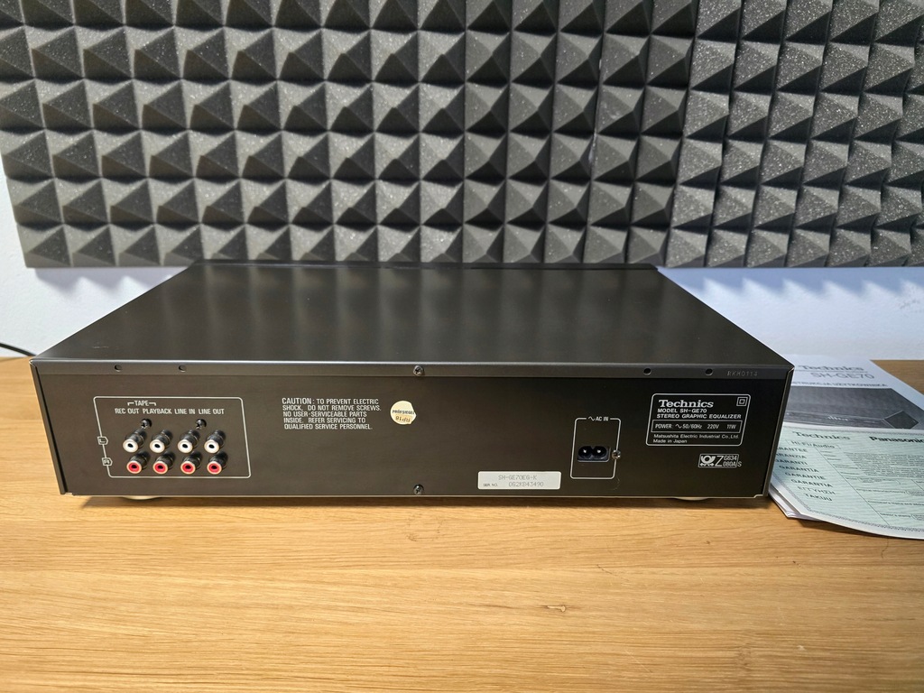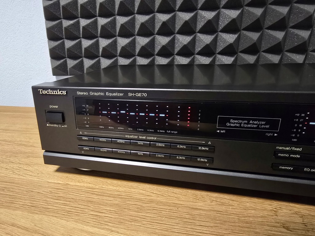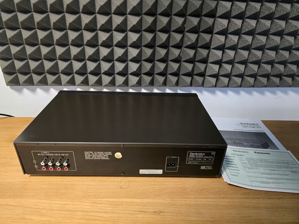 Producent: Technics Model: SH-GE 70 Typ: Korektor Lata budowy: 1990 - 2003 Wyprodukowano w: Japonii Kolor: czarny Technics Zdalne sterowanie: Pobór mocy: 11 W (6,5 W w trybie gotowości) Wymiary: 430 x 102 x 280 mm (szer. x wys. x gł.) Waga: 2,9 kg Nowa cena ok.: 399 DM Znajomości Liczba wejść: Przełącznik sygnału wejściowego: 150mV/1V, 47kOhm Liczba wyjść: Wyjście: 1 V, 600 omów, maksymalnie 8 V (1 KHz, THD 0,01% Dane techniczne Regulowane pasma częstotliwości: 2 x 7 Zakres regulacji: +/- 12 dB Pasmo przenoszenia: 5 Hz ~ 100 kHz Stosunek sygnału do szumu: 98 dB THD: 0,005%