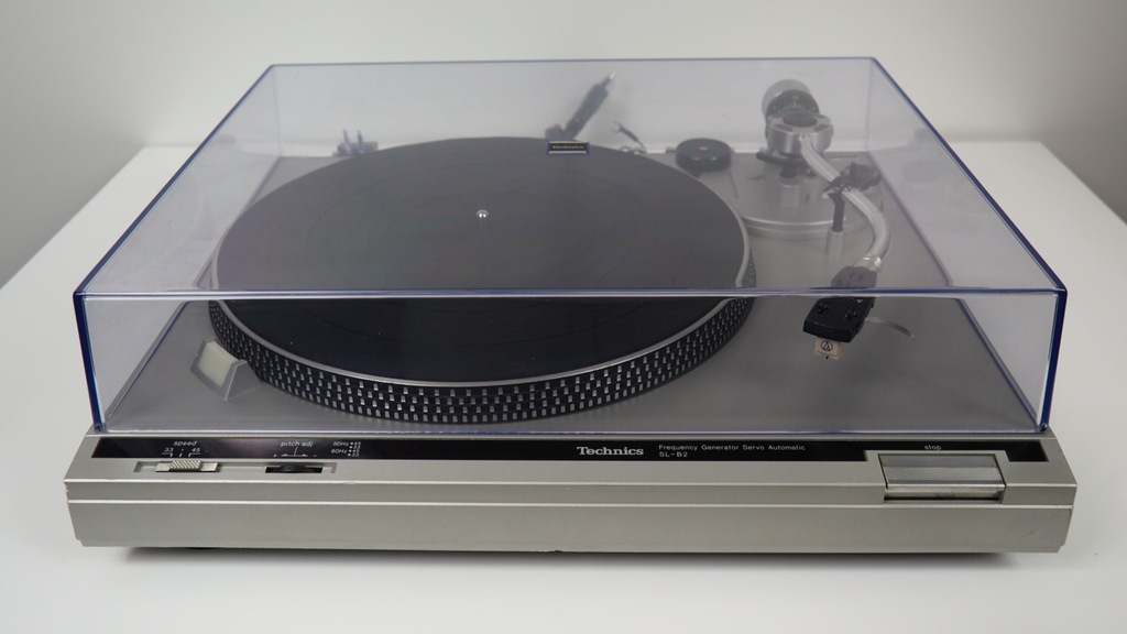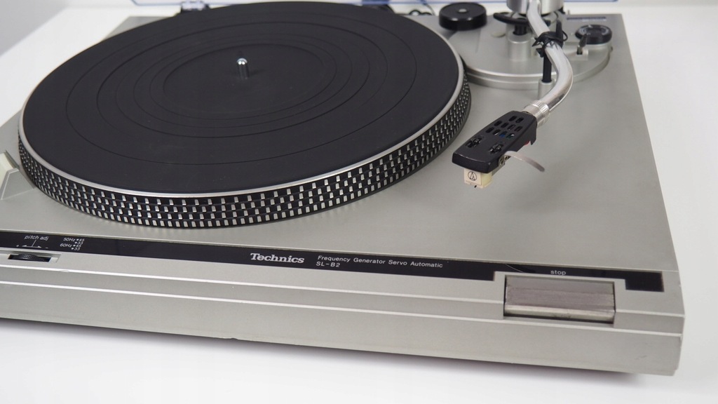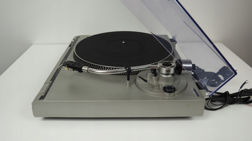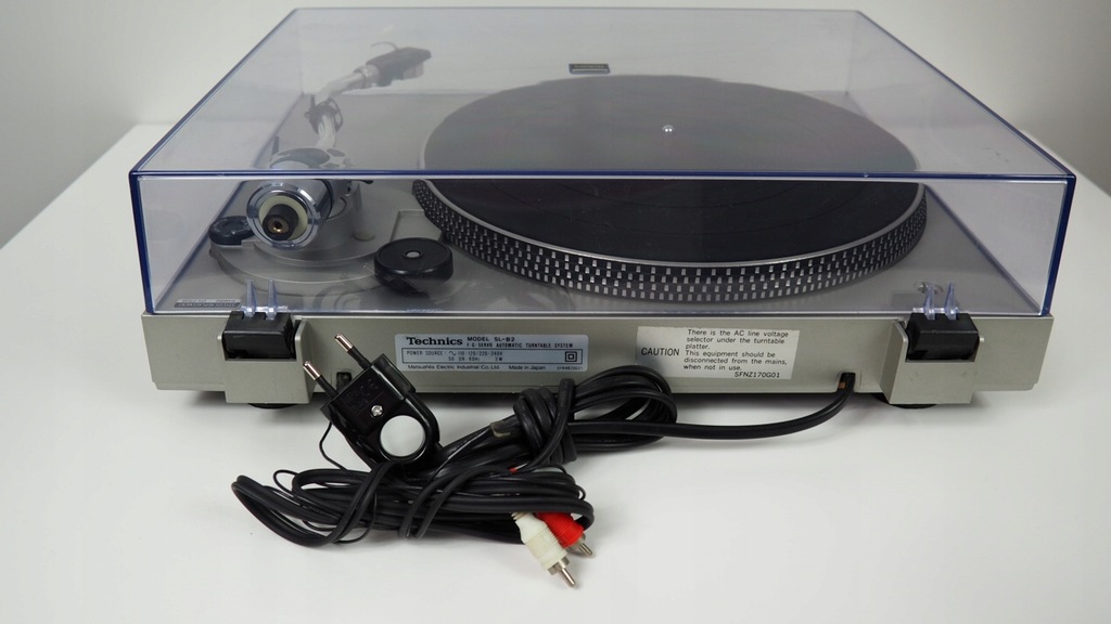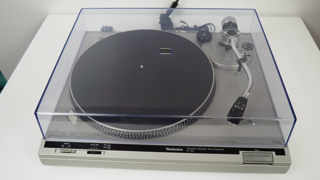 Gramofon Technics SL-B2, kolor srebrny. Stan wizualny jak na zdjęciach, pokrywa została wypolerowana, ale z tyłu ma ułamany kawałek plastiku wchodzącego w zawias, ale normalnie zamyka się i otwiera. Gramofon sprawny, wszystkie funkcje działają.
