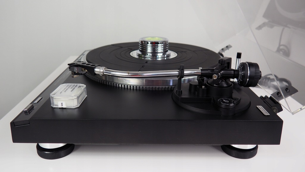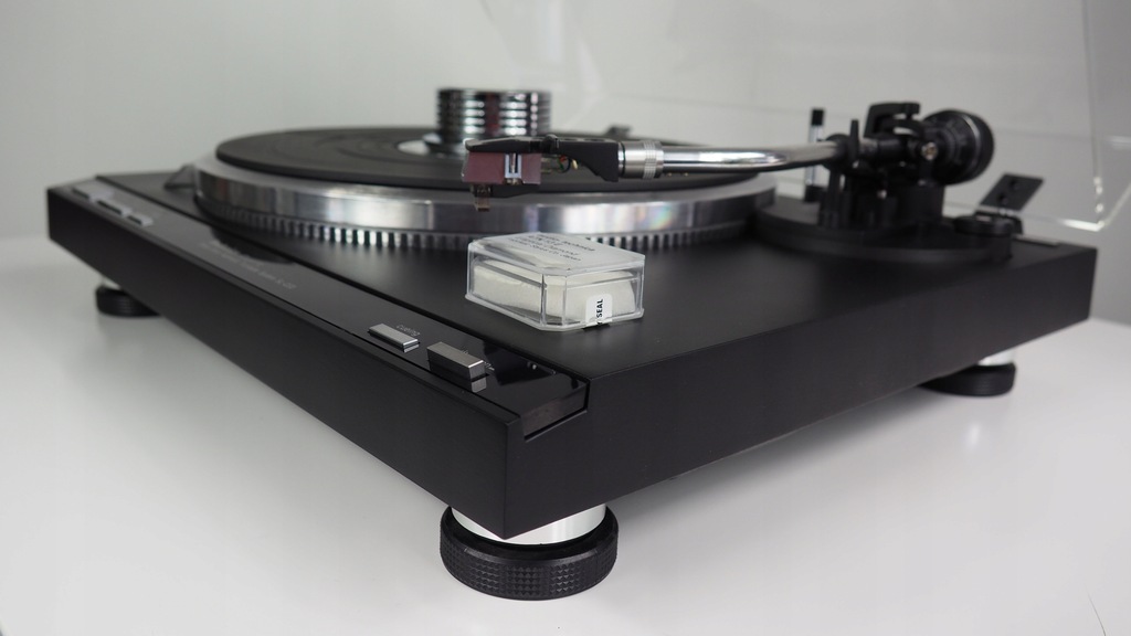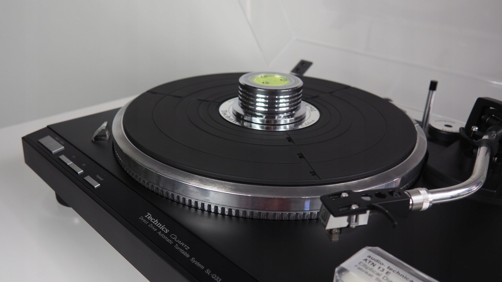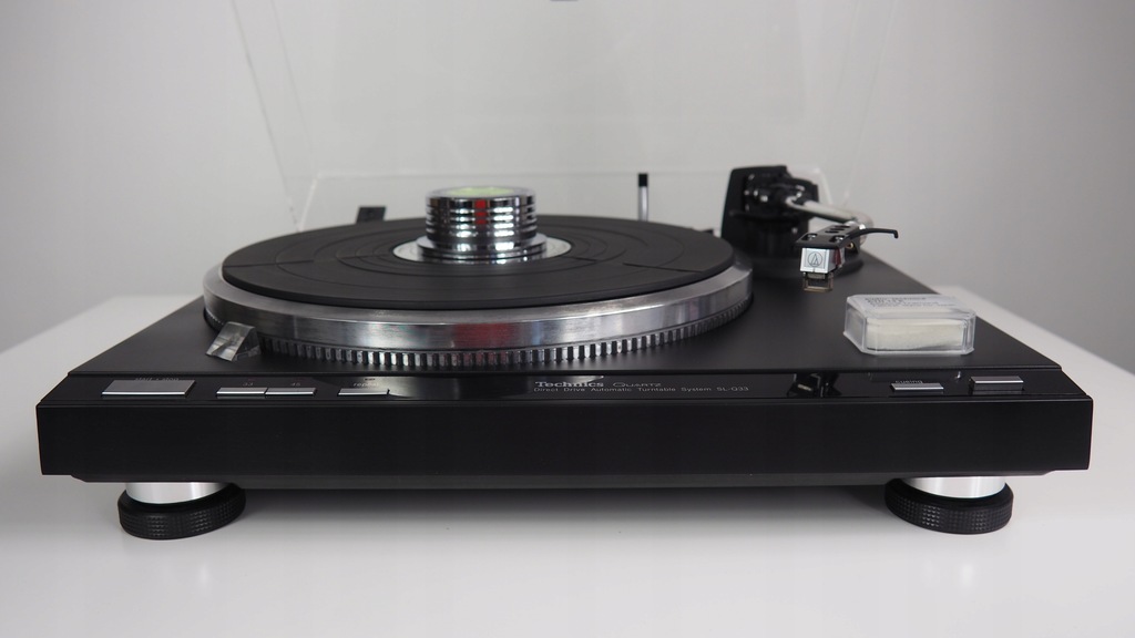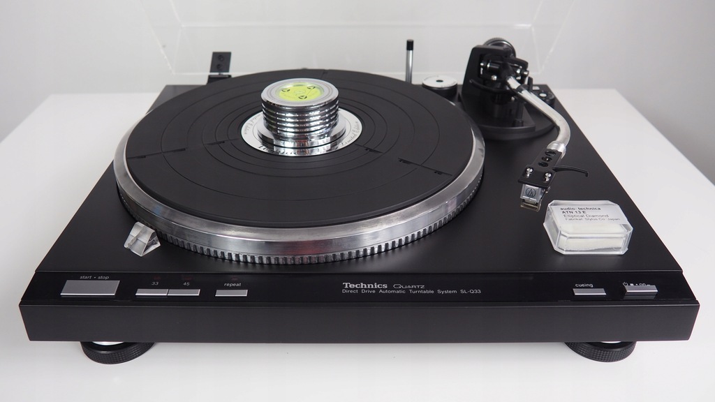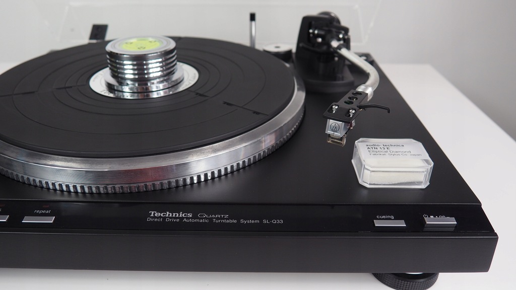 Gramofon Technics SL-Q33, wkładka z nową igłą Audio-Technica. Docisk w komplecie. Gramofon po serwisie. Stan wizualny jak nowy, po kompletnej renowacji obudowy. Nowa pokrywa, talerz wypolerowany. Wszystkie dodatki co na zdjęciach są w komplecie. W komplecie instrukcja.