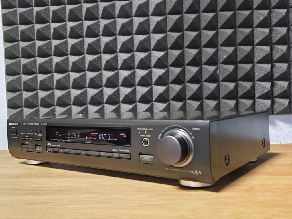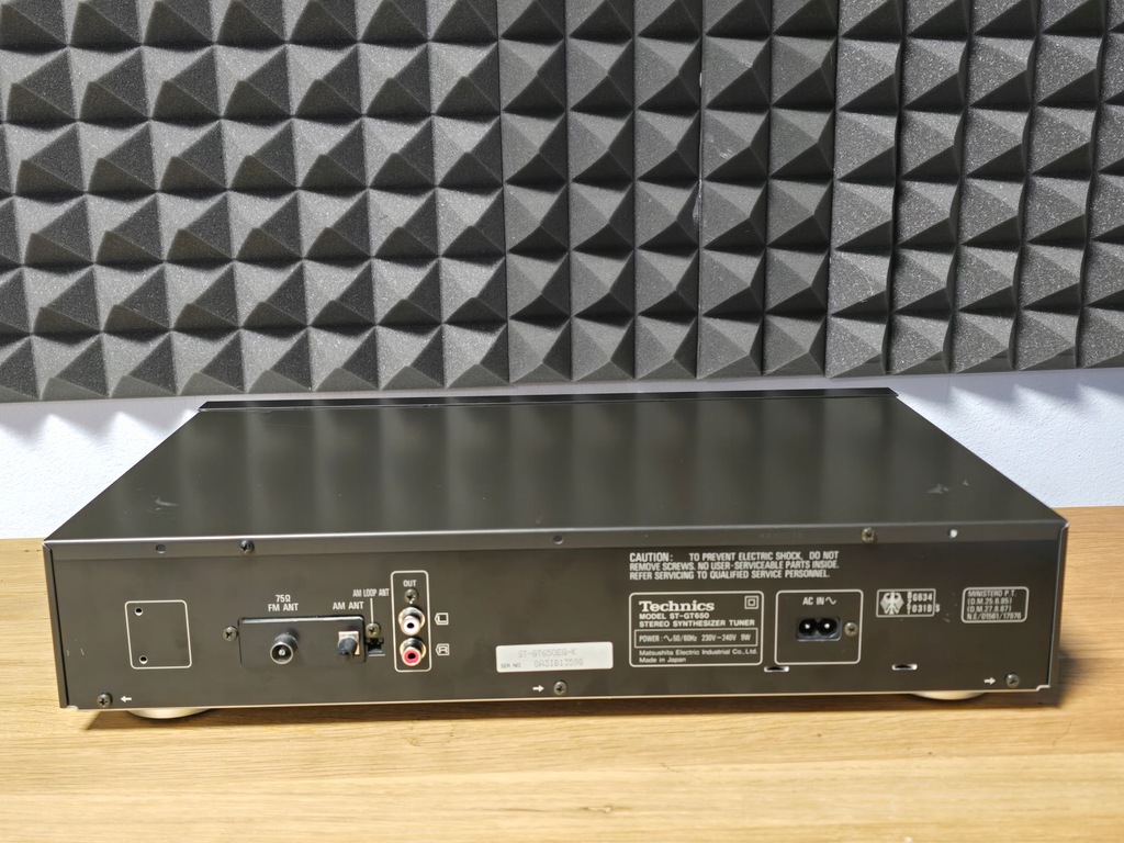 Technics Model: ST-GT 650 Typ: tuner Lata budowy: 1994 - 1995 Wyprodukowano w: Osaka, Japonia Kolor: czarny Technics Pilot zdalnego sterowania: nie Pobór mocy: 9W Wymiary: 430 x 91,5 x 308 mm Waga: ok. 3,5 kg Nowa cena ok.: 499 DM Znajomości Liczba wyjść: 1 2xRCA Liczba wejść: 3 Antena AM Antena UKF Antena pętlowa AM Dane techniczne Odbiór: FM/MW Częstotliwości: FM: 87,50–108,00 MHz MW: 522 kHz - 1611 kHz Pasmo przenoszenia: 10 Hz do 15 kHz, +0,5 dB do -1,0 dB Czułość wejściowa: 1,5 mikrowolta THD: 0,05% (mono), 0,1% (stereo) Stosunek sygnału do szumu: 75 dB (mono), 66 dB (stereo) Odchylenie kanału (250 Hz - 6,3 kHz): +/- 1,0 dB Selektywność: Normalny +/- 400 kHz: 70 dB Bardzo wąskie +/- 200 kHz: 25 dB Tłumienie częstotliwości obrazu przy 98 MHz: 100 dB Tłumienie IF przy 98 MHz: 95 dB Tłumienie AM: 55dB Poziom wyjściowy: RDS: tak Pamięć stacji: tak (39)