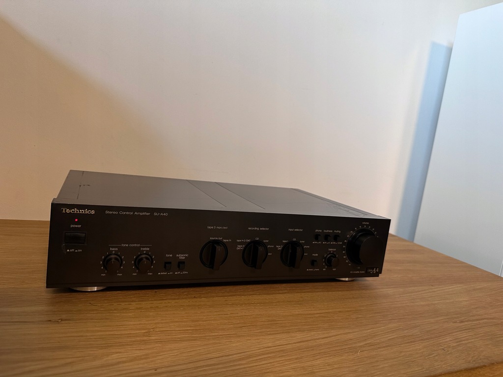 Technics Model: SU-A 40 Typ: Przedwzmacniacz Lata budowy: 1988 - 1991 Wykonane w Japonii Kolor: brązowy Technics Pilot zdalnego sterowania: Nie Pobór mocy: 8W Wymiary: 430 x 103 x 290 mm (szer. x wys. x gł.) Waga: 4kg Nowa cena ok.: 700 DM znajomości Liczba wejść: 6 DAT/taśma 2, czułość 75mV Taśma 1, czułość 75mV CD, czułość 75mV Tuner, czułość 75mV AUX, czułość 75mV Phono, czułość MM 1,25 mV, 1 kHz, poziom wyjściowy 500 mV Liczba wyjść: 1 złącze RCA Dane techniczne Pasmo przenoszenia: 0,8 Hz - 150 000 Hz Całkowite zniekształcenia harmoniczne: <= 0,009% Stosunek sygnału do szumu: Separacja kanałów stereo: Kontrola tonu Bas: ±5dB Wysokie: ± 5 dB Głośność: przycisk Filtr subsoniczny: 20 Hz, przycisk Wyciszenie: -20dB, przycisk Mono: tak, przycisk Bezpośredni/Linia-Prosta: tak, przycisk Dalsze dane w „Hifi-Engine”: [1]