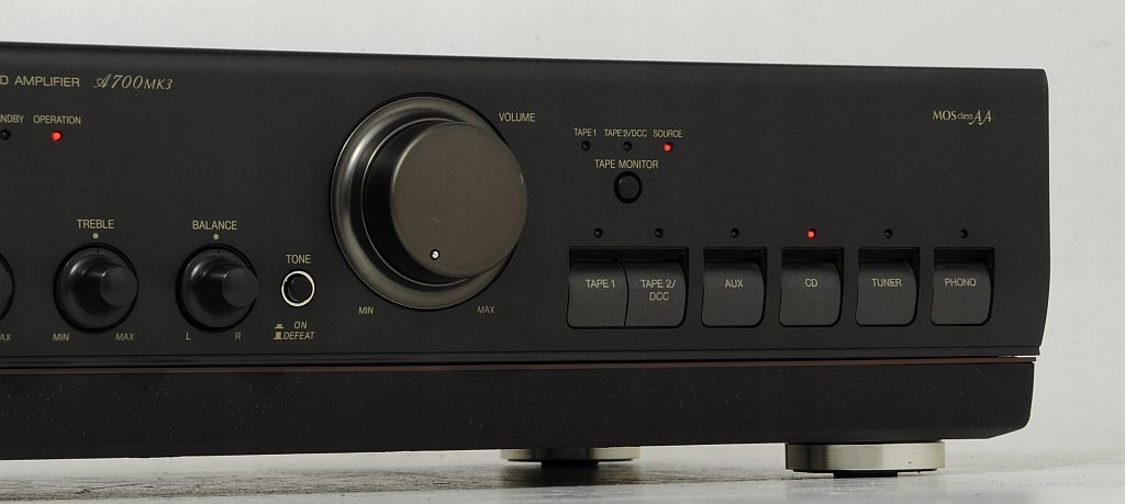 - Sześciopozycyjny przełącznik wejść ( CD, Tape1, Tape 2/ DCC, Tuner, Gramofon analogowy, AUX)
