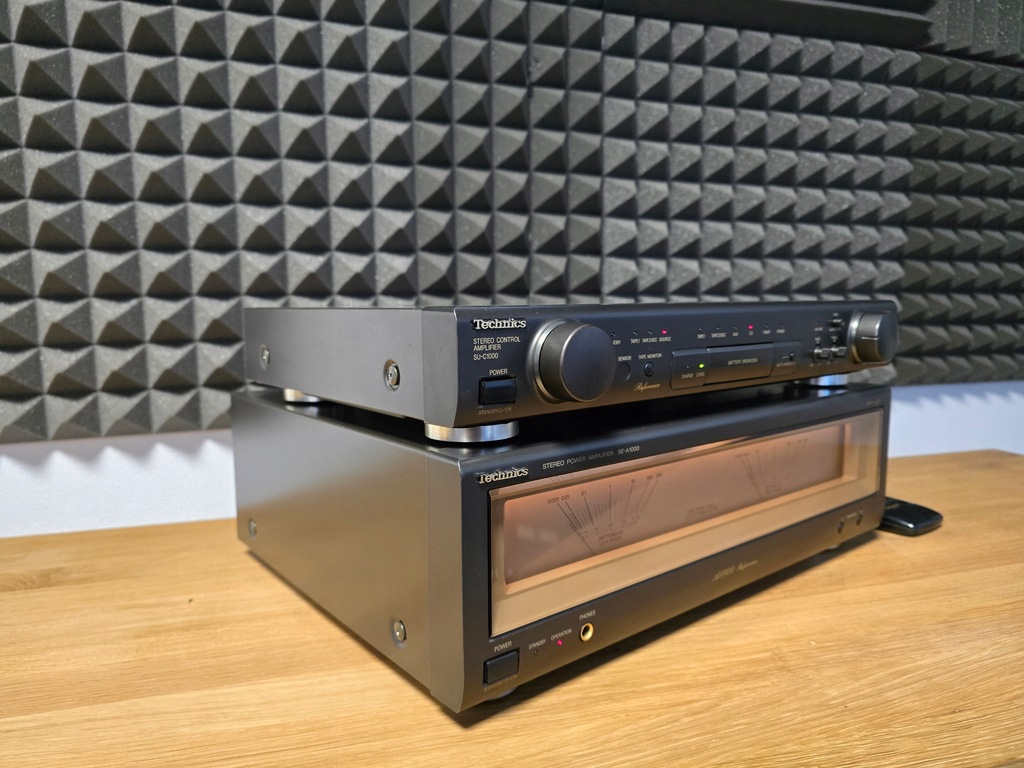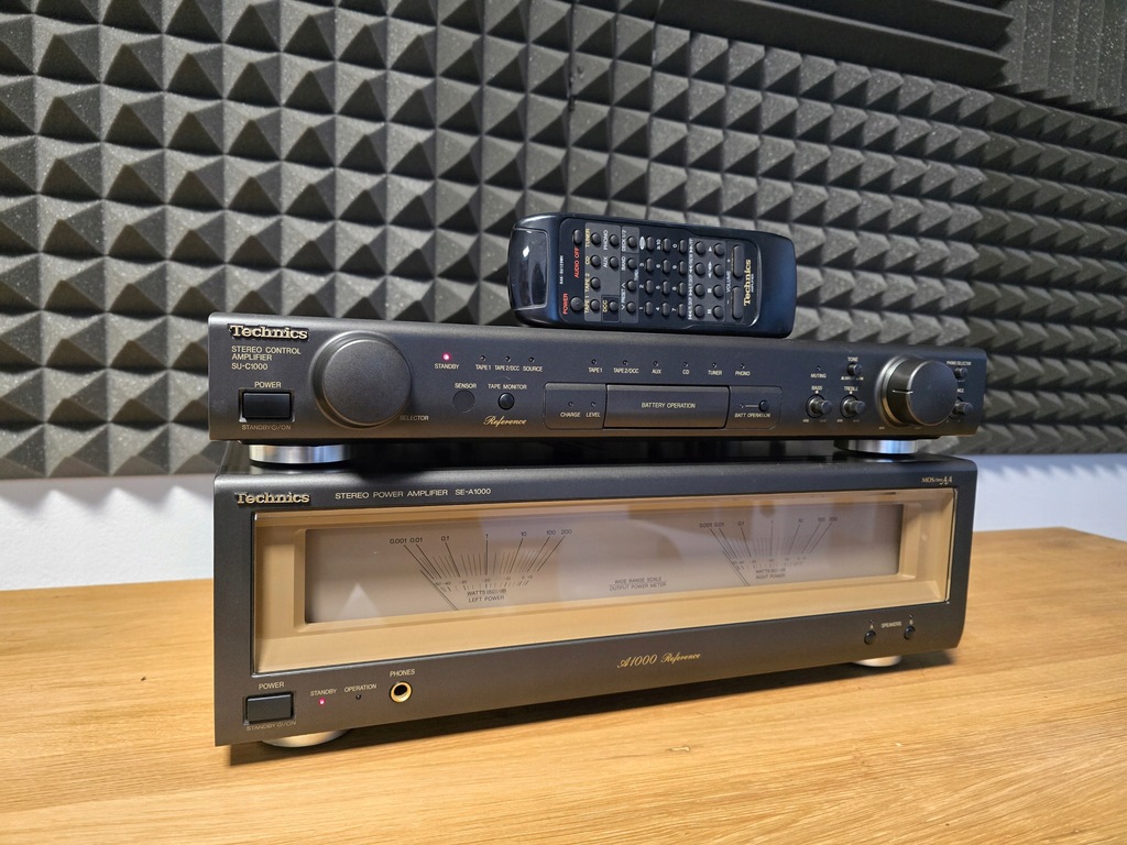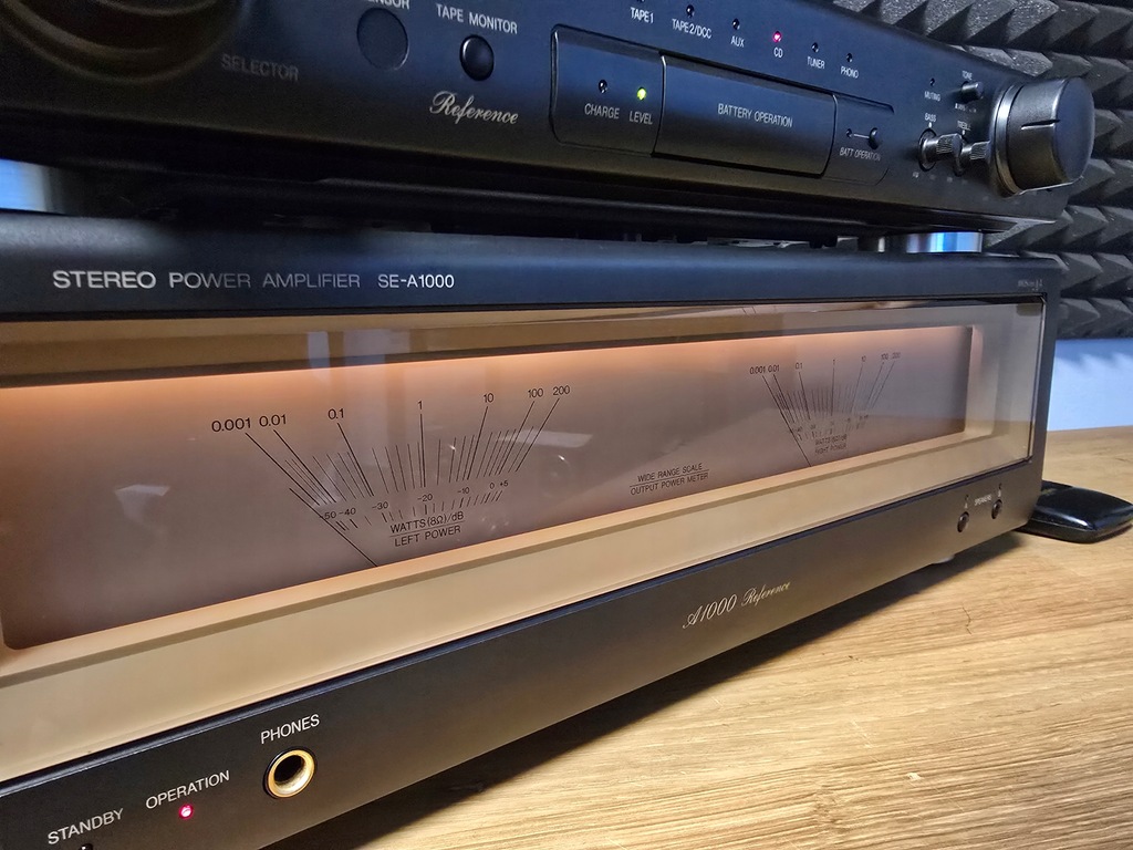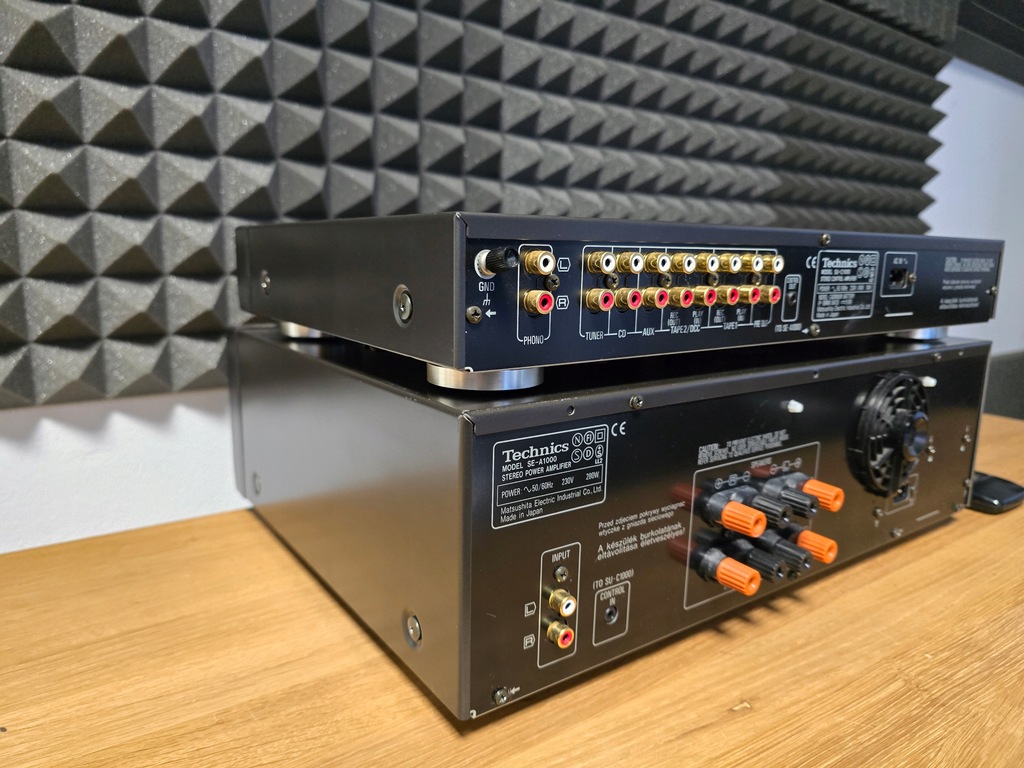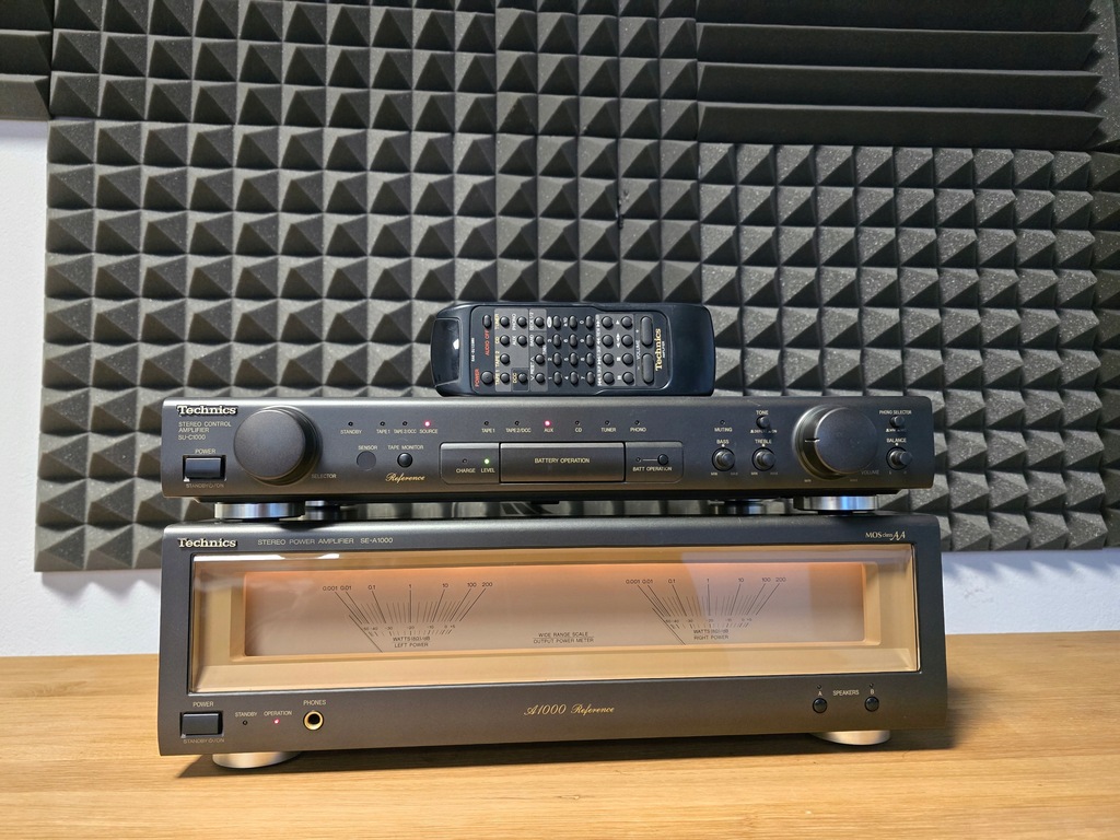 Technics Model: SE-A 1000 Typ: wzmacniacz mocy Lata budowy: 1995 - 1997 Wyprodukowano w: Osaka, Japonia Kolor: czarny Technics Pilot zdalnego sterowania: tak (w połączeniu z Technics SU-C 1000) Pobór mocy: 285 W (łącznie z przedwzmacniaczem) Wymiary (szer. x wys. x gł.): 430 x 136 x 344 mm Waga: 8,7 kg Nowa cena ok.: 70 000 jenów (1995, Japonia), 1050 DM Znajomości Liczba wejść: 2 x RCA, 1 V/33 kOhm Liczba wyjść: Para głośników A lub B: 4–16 omów Para głośników A + B: 8-16 omów Słuchawki stereo typu jack 6,3 mm Dane techniczne Ciągła wydajność 8 omów: 2 x 70 W 4 omy: 2 x 120 W (DIN) Całkowite zniekształcenia harmoniczne: 0,01% (8 omów) Współczynnik tłumienia: 70 (8 omów), 35 (4 omy) Pasmo przenoszenia: 5 Hz-70 kHz (+0,-3 dB), 20 Hz-20 kHz (+0,-0,5 dB) Stosunek sygnału do szumu: 110 dB zgodnie z IHF'66 Separacja kanałów stereo: 95 dB Specjalny sprzęt 2 duże analogowe wyświetlacze mocy wyjściowej