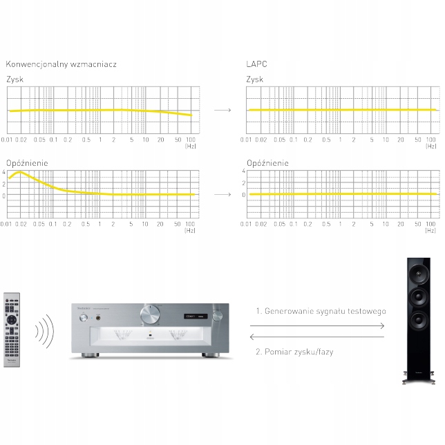 Impedancja kolumn głośnikowych zmienia się przy poszczególnych częstotliwościach, dlatego wzmacniacz powinien napędzać głośniki w sposób niezależny od ich charakterystyki. Niemniej jednak konwencjonalne wzmacniacze cyfrowe są podłączone do kolumn za pośrednictwem filtra dolnoprzepustowego w stopniu wyjściowym, co powoduje, że wpływ charakterystyki impedancji kolumn na te wzmacniacze jest jeszcze większy. Ponadto podczas gdy charakterystykę amplitudową konwencjonalnych wzmacniaczy można było poprawić ze względu na ujemne sprzężenie zwrotne, nie udawało się poprawić charakterystyki fazowej. Dlatego właśnie opracowaliśmy algorytm optymalizacyjny, dzięki któremu uzyskuje się idealną odpowiedź impulsową za pomocą cyfrowego przetwarzania sygnału poprzez pomiar charakterystyki fazy — amplitudy częstotliwości wzmacniacza dla podłączonych głośników. Ta nowa technika umożliwia spłaszczenie charakterystyki częstotliwościowej amplitudy i fazy, co wcześniej nie było możliwe, jak również zapewnia wysoką jakość dźwięku o bogatym wyrazie przestrzennym.