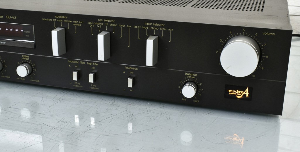 Wzmacniacz posiada piękny, klasyczny design co w powiązaniu z eleganckim aluminiowym frontem stanowić będzie upiększenie pokoju (nie to co dzisiejsze "plastikowe" sprzęty malowane na kolor srebrny), model ten jest jednym z mocniejszych stworzonych przez Technics'a pracujący w klasie A, jego pobór mocy to aż 460 watt dając moc 2x100W/8Ohm!! Dzięki budowie w klasie A i całkowitym poborze mocy 460W oraz kondensatorom 2 x 6800 mikroFaradów, wielkiemu trafo wzmacniacz jest bardzo stabilny, dźwięk nie jest zniekształcony jak to bywa w słabych wzmacniaczach a bas jest głęboki i czysty nawet przy głośnym odsłuchu. Można śmiało podłączyć naprawdę potężnej mocy kolumny, podłączałem ten wzmacniacz pod kolumny Tonsil Perfect 150 i nie mogłem słuchać głośniej niż na 70-80%. Wzmacniacz posiada wskaźnik wysterowania 0-100Watt/8Ohm ale przy podkręceniu volume powyżej 7-8 brak na nim skali :) Posiada możliwość podłączenia 2 par kolumn, para MAIN lub REMOTE (4-16Ohm) bądź MAIN+REMOTE (8-16Ohm). Posiada regulację bass, treble, balans, funkcję podbicia tonów Loudness, możliwość nagrywania z Decka 1 na 2 lub z Decka 2 na 1 (Tape1, Tape2), załączenie/odłączanie par kolumn Main i Remote (np. gdy chcemy słuchać muzyki tylko na słuchawkach). Posiada wejścia na 5 urządzeń, gniazdo słuchawkowe, bardzo ładny, świecący na niebiesko fluorosencyjny wskaźnik wysterowania mocy (wyjściowej) stereo, logo NEW CLASS A widoczne na panelu jest podświetlane co daje ładny efekt w ciemnościach. Doskonałe zabezpieczenia, m.in. wyjście mocy na kolumny na osobnych przekaźnikach. Wzmacniacz oparty wyłącznie na japońskich podzespołach co gwarantuje jego jeszcze długoletnią bezawaryjną pracę.