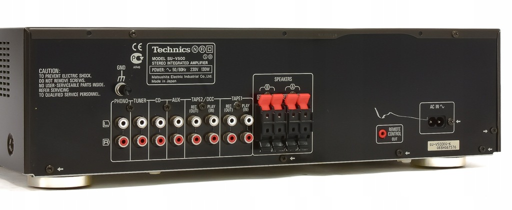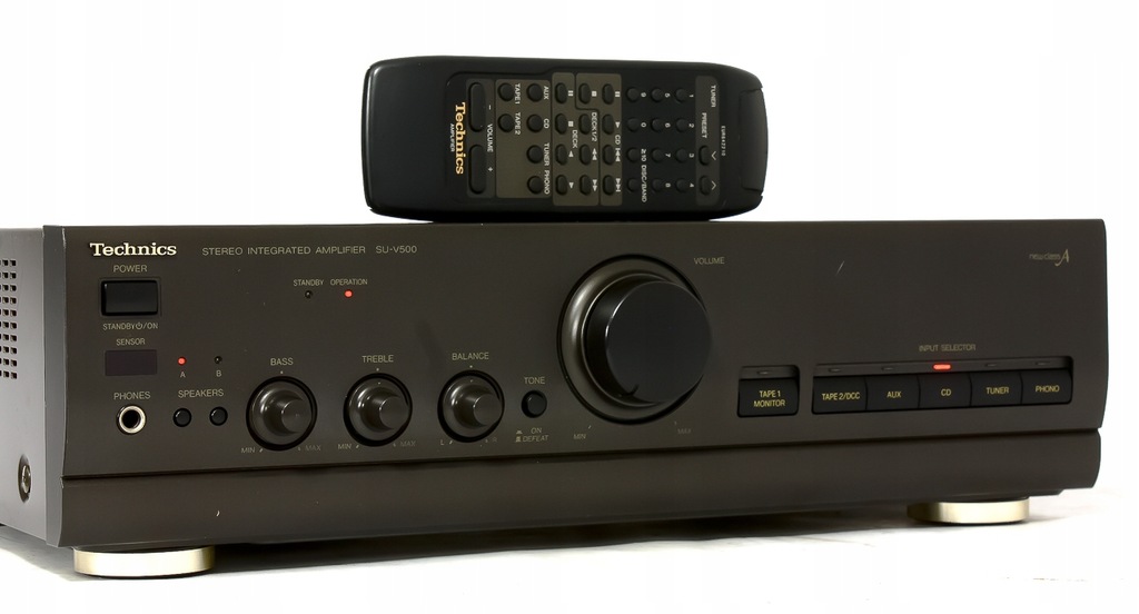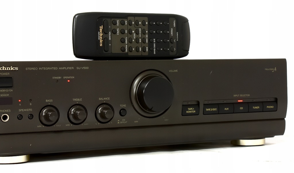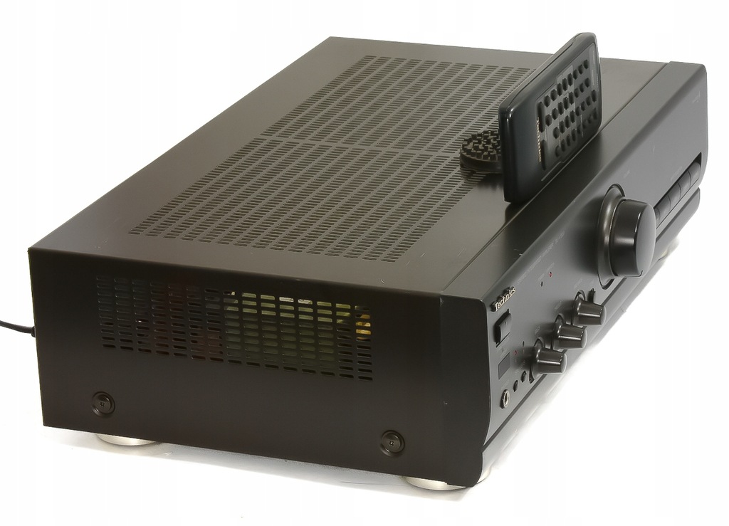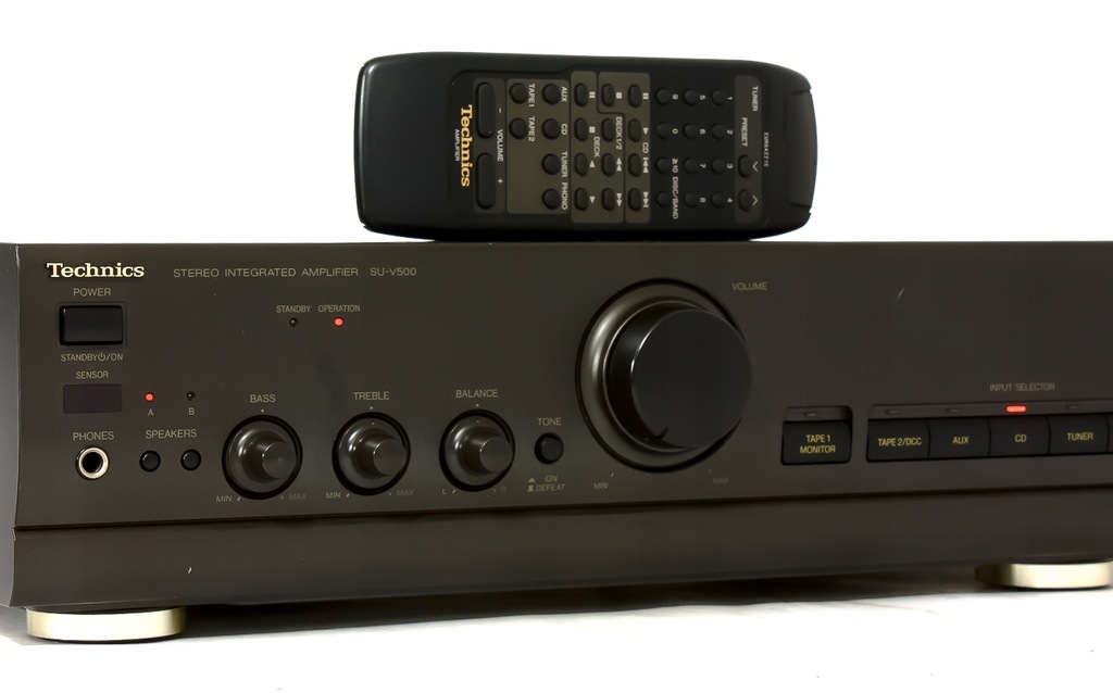 Przedmiotem sprzedaży jest wzmacniacz Technics'a, model SU-V500. Sprzęt pochodzi jeszcze z czasów produkcji japońskiej, co gwarantuje wysoką jakość wykonania i brzmienia. Wzmacniacz bardzo ładnie się prezentuje, posiada purystyczny, nieco surowy design. Urządzenie nafaszerowane jest wysokiej klasy elektroniką. Najważniejsza jest jednak moc - wzmacniacz pobiera z sieci 130W, co przekłada się na !!prawdziwe!! 2 x 50 Watt przy obciążeniu równym 4ohmom. Wzmacniacz dysponuje sporym zapasem mocy i jest w stanie napędzić niemałe kolumny - najczęściej głośniki osiągną kres swych możliwości już przy około 1/2 mocy wzmacniacza. Dźwięk, który oferuje sprzedawany wzmacniacz jest energiczny, szczegółowy i dobrze separowany. Podstawę stanowi mocny i niski bass. Sprzęt posiada wiele funkcji, np. Loudness pozwala na dodatkowe podbicie, które przy dobrych głośnikach basowych dosłownie wciska w fotel...Wzmacniacz posiada podwójne portale głośnikowe, co pozwoli podłączyć kolumny w systemie BI-WIRING. Podsumowując, Technics SU-V500 to doskonała propozycja Technicsa, łącząca w sobie wyjątkowe umiejętności muzyczne, wysoką moc, b. dobrą jakość wykonania i niebanalny wygląd. Polecam!