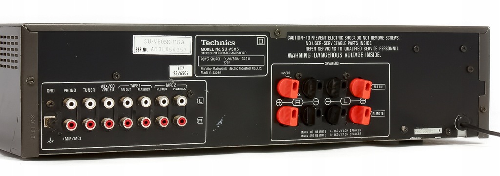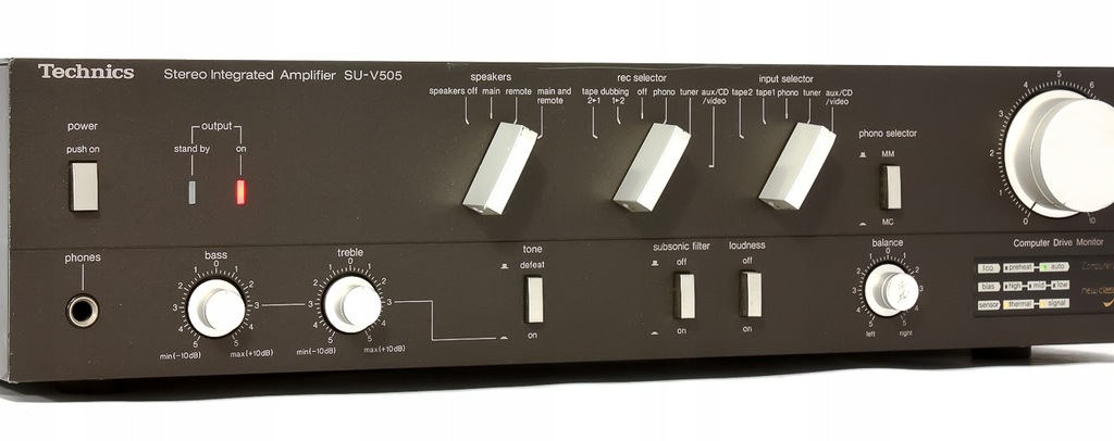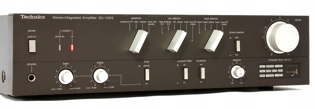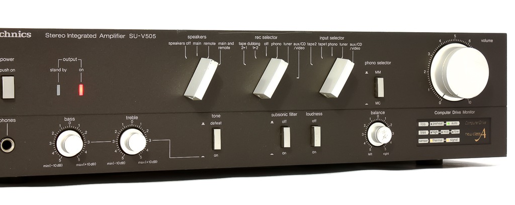 Wzmacniacz posiada bardzo dużą moc wyjściową, jego max pobór mocy z sieci to aż 370 Watt co daje około 2 x 120Watt max! Dzięki swej budowie w klasie A i całkowitym poborze mocy 370Watt oraz kondensatorom 2 x 8200 mikroFaradów (zapewniają duży zapas napięcia podczas mocnego uderzenia basu), wielkiemu trafo wzmacniacz jest bardzo stabilny, dźwięk jaki słyszymy w kolumnach nie jest zniekształcony a generowany bas jest mocny (nie charczący jak w słabych wzmacniaczach) niemalże do samego końca skali volume, można śmiało podłączyć naprawdę dużej mocy kolumny! Wzmacniacz posiada możliwość podłączenia 2 par kolumn, para MAIN lub REMOTE (4-16Ohm) bądź MAIN+REMOTE (8-16Ohm) - z tyłu znajduje się przełącznik impedancji. Posiada regulację bass, treble, balans, funkcję podbicia tonów Loudness która to znacznie uwydatnia przede wszystkim tony niskie, możliwość nagrywania z Decka 1 na 2 lub z Decka 2 na 1 (Tape1, Tape2), załączenie/odłączanie par kolumn Main i Remote (np. gdy chcemy słuchać muzyki tylko na słuchawkach). Posiada wejścia na 5 segmentów, istnieje możliwość podłączenia korektora graficznego do TAPE1, gniazdo słuchawkowe. Wyjścia (końcówki mocy) zabezpieczone są przekaźnikami, gdy przełączamy pary MAIN, REMOTE przełącza się przekaźnik, wzmacniacz posiada również zabezpieczenie termiczne (gdyby radiator się przegrzał wzmacniacz samoczynnie się wyłączy) oraz kontrolę napięcia w układzie (po włączeniu zasilania układ sprawdza napięcie i gdy wszystko jest OK załącza końcówki mocy). Wzmacniacz to prawdziwy japończyk (zbudowany całkowicie na japońskich podzespołach) jakich dziś się już nie produkuje dlatego będzie jeszcze długo i bezawaryjnie służył swojemu właścicielowi!