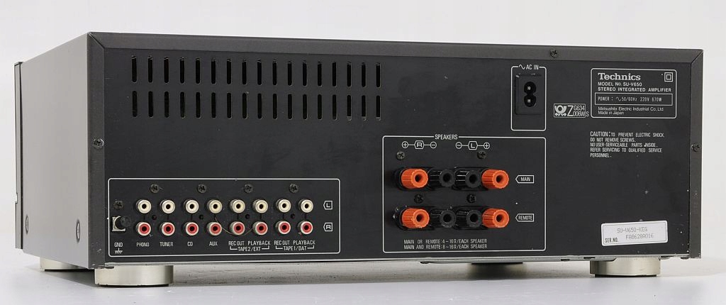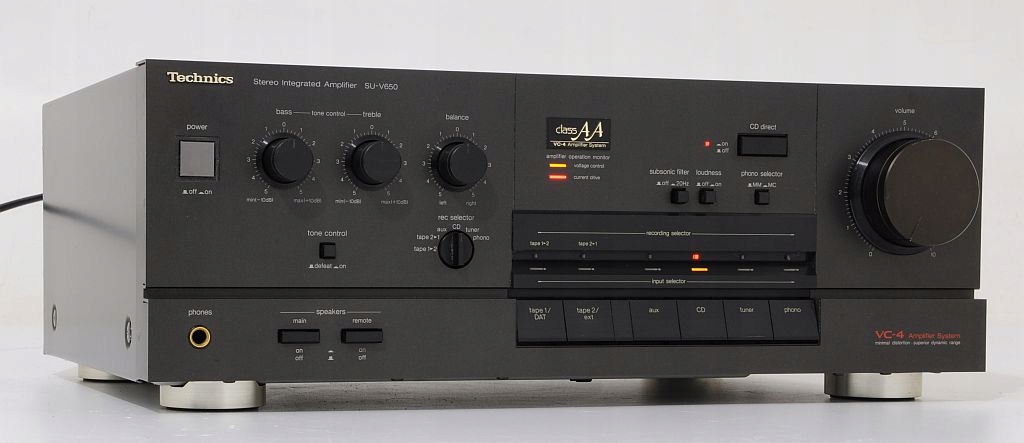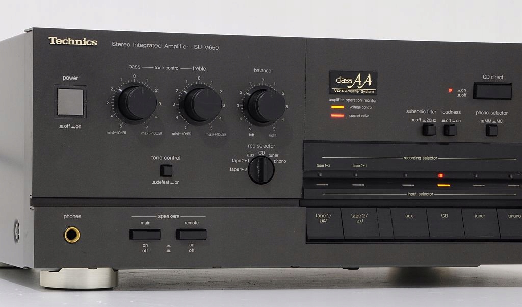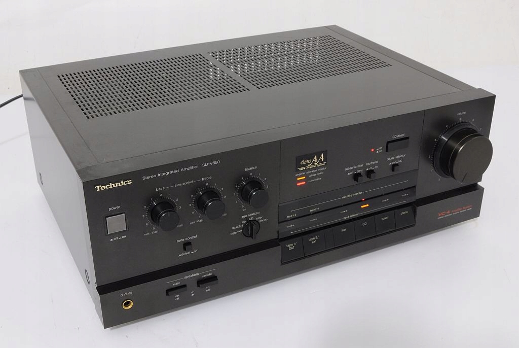 Technics SU-V650 to klasa sama w sobie. Znawcom tematu nie trzeba go przedstawiać. Dla mniej wtajemniczonych powiem, że jest to jeden z najbardziej udanych modeli Technics'a, który wyszedł na rynek w latach świetności firmy. Jest to jeden z lepszych wzmacniaczy tej firmy pochodzący wg mnie z najlepszej serii SU-V. Swoim dźwiękiem wręcz miażdży takie modele jak SU-A300, SU-A500 czy nawet SU-A700, nie dorównują mu nawet wzmacniacze typu dzielonego jak SU-A800 czy SU-A900 a to dlatego że czas ich produkcji przypada na zgubną marketingową transformacje firmy - zrobione z niskiej klasy materiałów i komponentów (np. plastikowy panel i pokrętła, SU-V660 wszystko aluminium!!!). :) Wystarczy spojrzeć na masę SU-V650 to 11 kg, a np SU-A500 ok 7kg. SU-V650 to dynamika, moc i czystość tak najkrócej można to opisać. Potrafi zapewnić głęboki bass i świetny wyrazisty lecz nie natarczywy sopran nie zapominając przy tym o dźwiękach średnich. Przy tym wszystkim dźwięk jest czysty i dynamiczny. Dzięki swym wysokiej jakości komponentom - ogromny transformator i świetne kondensatory - posiada ogromną moc znamionową 110W/8 Ohm przez co potrafi napędzić nawet najbardziej wymagające kolumny. Na jakość dźwięku mogą także korzystnie wpływać takie funkcje jak: Power Amp Direct - czyli pominięcie przedwzmacniacza oraz Bi-Wiring czyli odseparowanie głośnika niskotonowego od średnio-wysokotonowego. Wykonany w samej Japonii-kolebce światowej elektroniki, a nie jak wszystkie dzisiejsze marketingowe produkcje na Tajwanie, w Chinach lub Malezji