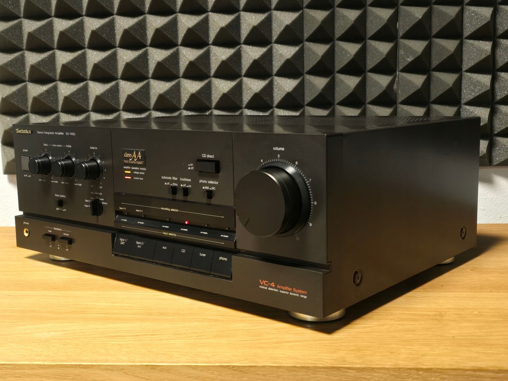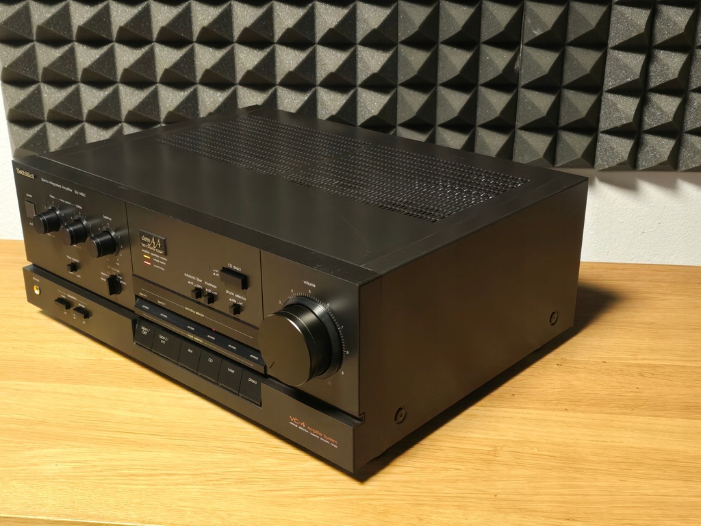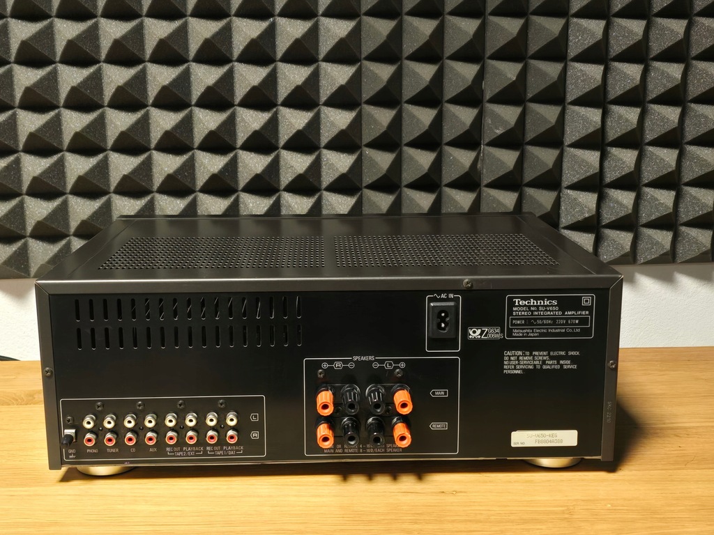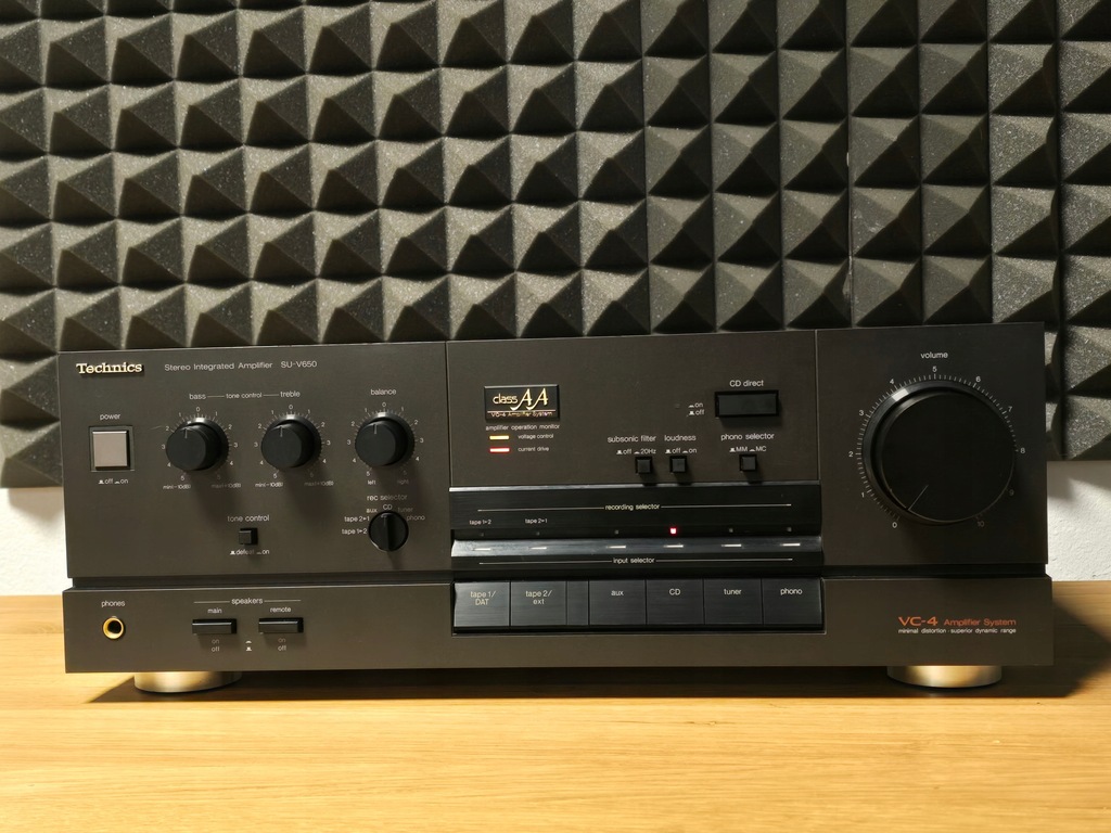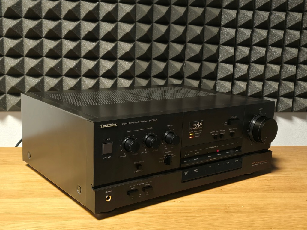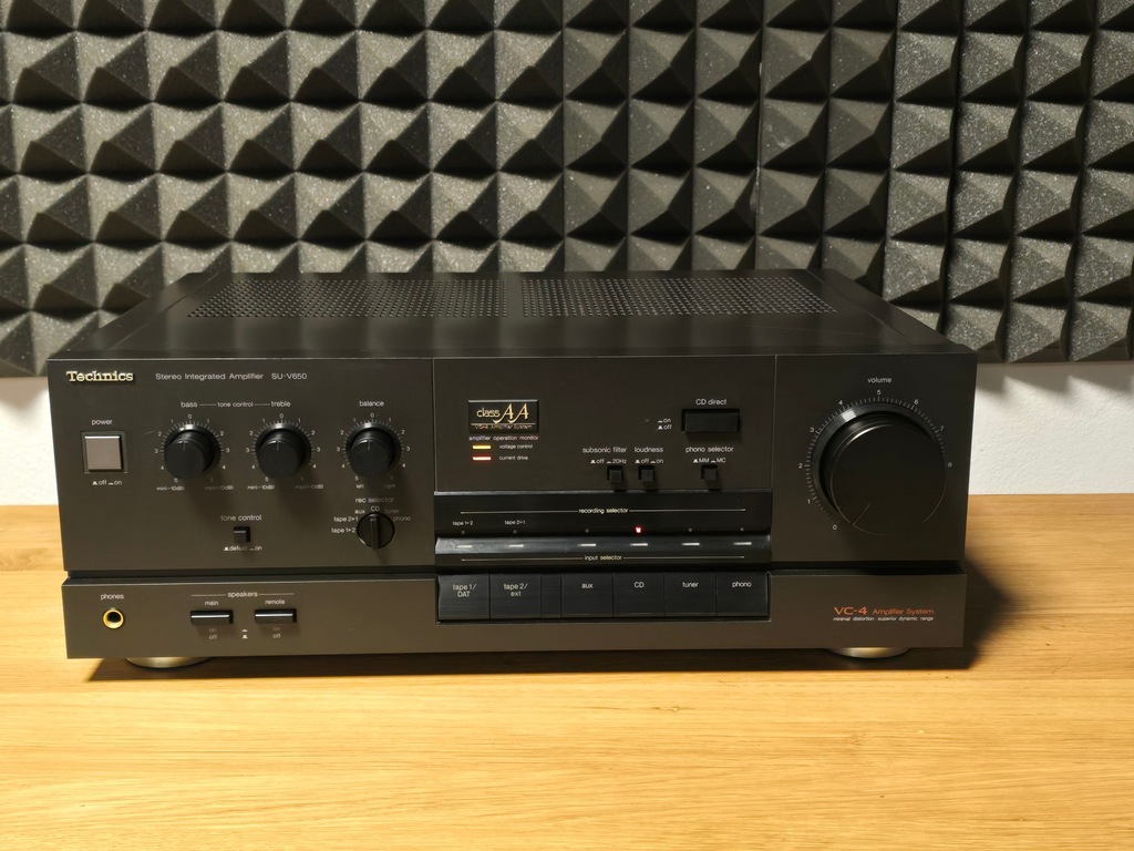 Technics Model: SU-V 650 Lata budowy: 1987/1988 Wyprodukowano w: Japonii Kolor: czarny Typ: analogowy, klasa AA Pilot zdalnego sterowania: Nie Pobór mocy: 670 W (maks.) Wymiary: Waga: 12,1 kg Nowa cena: 899,00 DM Znajomości Liczba wejść: 2x taśma AUX płyta CD tuner Phono (MM lub MC) Liczba wyjść: 2x taśma 2 pary głośników Dane techniczne Moc ciągła (przy zniekształceniach harmonicznych) 8 omów: 2x 90 W (20–20 000 Hz) 4 omy: 2x 140 W (DIN, 1 kHz) Dynamiczna wydajność 8 omów: 4 omy: Całkowite zniekształcenia harmoniczne: 0,000008% (1 kHz, 1 W) Współczynnik tłumienia: Pasmo przenoszenia: Stosunek sygnału do szumu: Separacja kanałów stereo: Kontrola tonu: Bas: tak Trebel: tak Głośność: tak Wysoki filtr: Filtr dolny (poddźwiękowy): tak, 20 Hz Niemy: Bezpośrednie/liniowe proste: tak Specjalny sprzęt Obwody zabezpieczające: Miękkie strzyżenie Przeciążać Zwarcie Przegrzanie