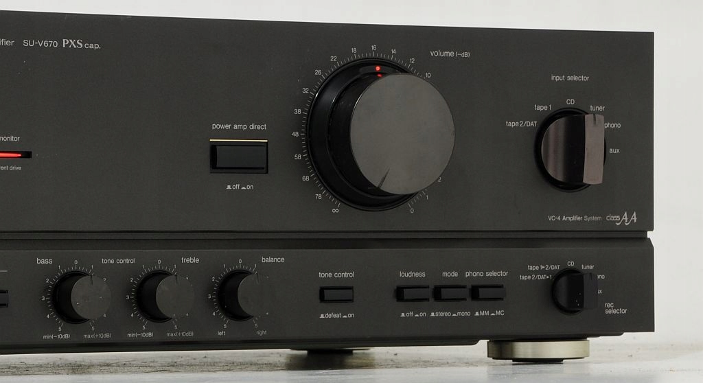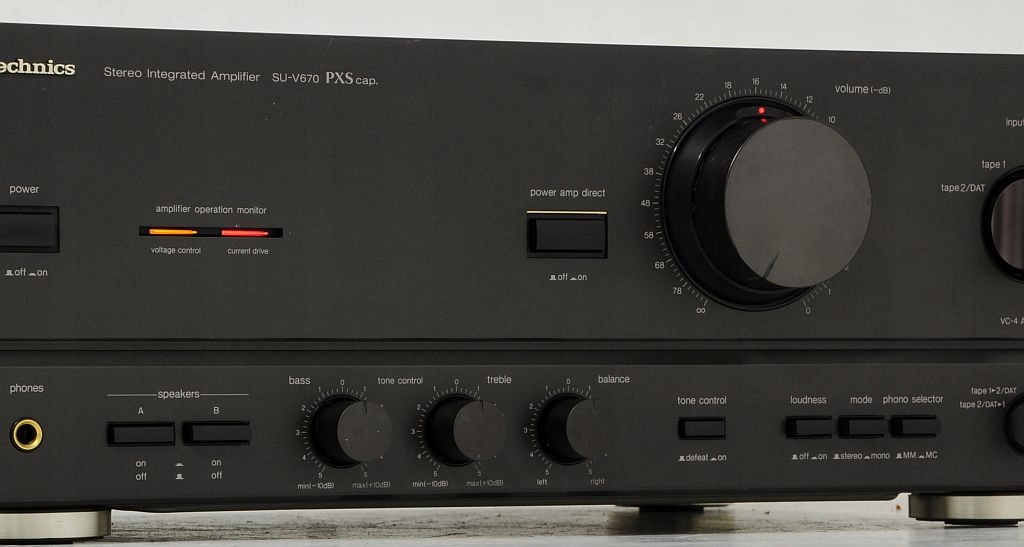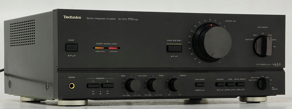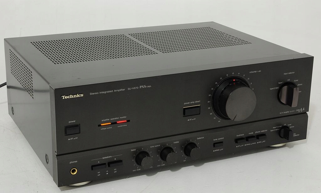 Technics SU-V670 PXS to klasa sama w sobie. Znawcom tematu nie trzeba go przedstawiać. Dla mniej wtajemniczonych powiem, że jest to jeden z najbardziej udanych modeli Technics'a, który wyszedł na rynek w latach świetności firmy, pochodzący wg mnie z najlepszej serii SU-V. Swoim dźwiękiem wręcz miażdży takie modele jak SU-A300, SU-A500 czy nawet SU-A700 a to dlatego że czas ich produkcji przypada na zgubną marketingową transformacje firmy - zrobione z niskiej klasy materiałów i komponentów (np. plastikowy panel i pokrętła, SU-V670 wszystko aluminium!!!). :) Wystarczy spojrzeć na masę SU-V670 PXS to 12 kg, a np SU-A500 ok 7kg. Dynamika, moc i czystość tak najkrócej można to opisać. Potrafi zapewnić głęboki bass i świetny wyrazisty lecz nie natarczywy sopran nie zapominając przy tym o dźwiękach średnich. Przy tym wszystkim dźwięk jest czysty i dynamiczny. Dzięki swym wysokiej jakości komponentom - ogromny transformator i świetne kondensatory - posiada ogromną moc znamionową 140W/4 Ohm przez co potrafi napędzić nawet najbardziej wymagające kolumny. Na jakość dźwięku mogą także korzystnie wpływać takie funkcje jak: Power Amp Direct - czyli pominięcie przedwzmacniacza oraz Bi-Wiring czyli odseparowanie głośnika niskotonowego od średnio-wysokotonowego. Wykonany w samej Japonii-kolebce światowej elektroniki, a nie jak wszystkie dzisiejsze marketingowe produkcje na Tajwanie, w Chinach lub Malezji. Ładne wykonanie - klasyczny wygląd w połączeniu ze świetnym dźwiękiem tworzą z SU-V670 prawdziwe cudo wśród wzmacniaczy !