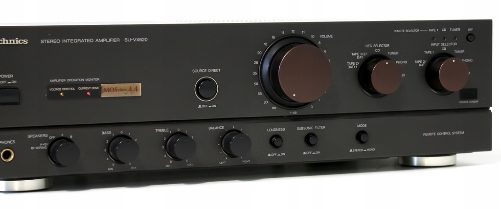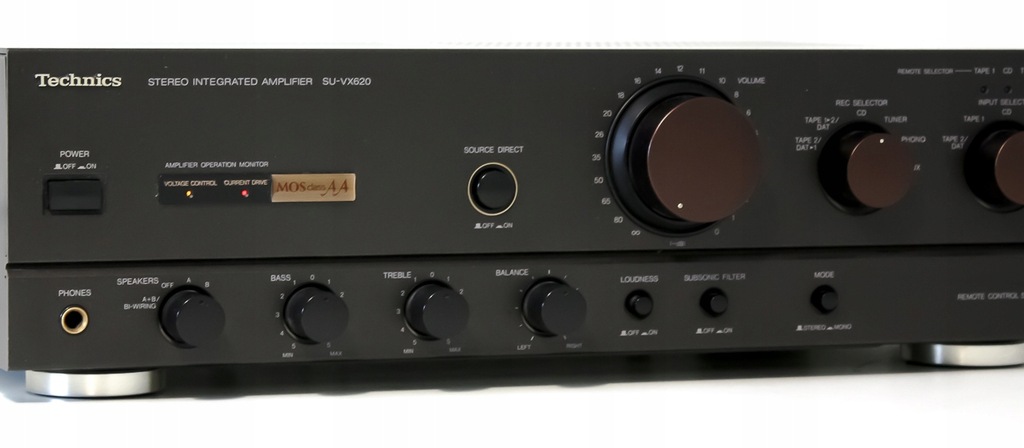 SU-VX620 to doskonale brzmiący i bardzo mocny wzmacniacz pracujący w czystej klasie AA, ma doskonały dynamiczny bas i czysty sopran, można na nim słuchać wszystkich rodzajów muzyki, jego stereofonia to dokładne odzwierciedlenie pełnej sceny muzycznej z wszystkimi detalami, tu nic nie ujdzie uwadze słuchacza jednym słowem bardzo dobry wzmacniacz do słuchania muzyki i to bardzo głośno. To naprawdę super wzmacniacz o żywym i pełnym dźwięku, na fundamencie mocnego i sprężystego basu. Jego nieocenioną zaletą jest funkcja LOUDNESS - podbicie dynamiki, sprawia ona że dźwięk staje się potężniejszy i bogatszy w bas i soprany. Panel przedni wykonany z aluminium. Zapraszam do zakupu!