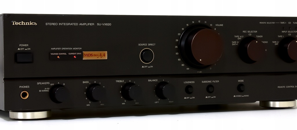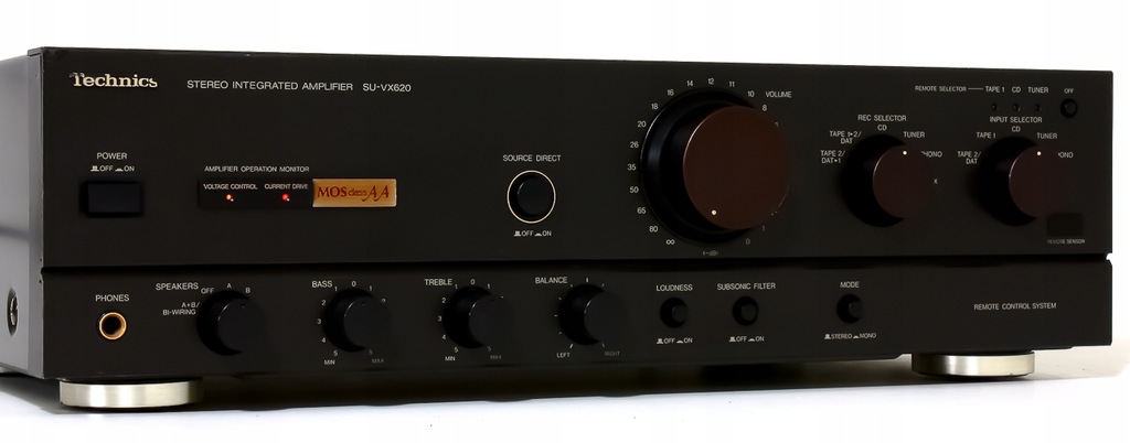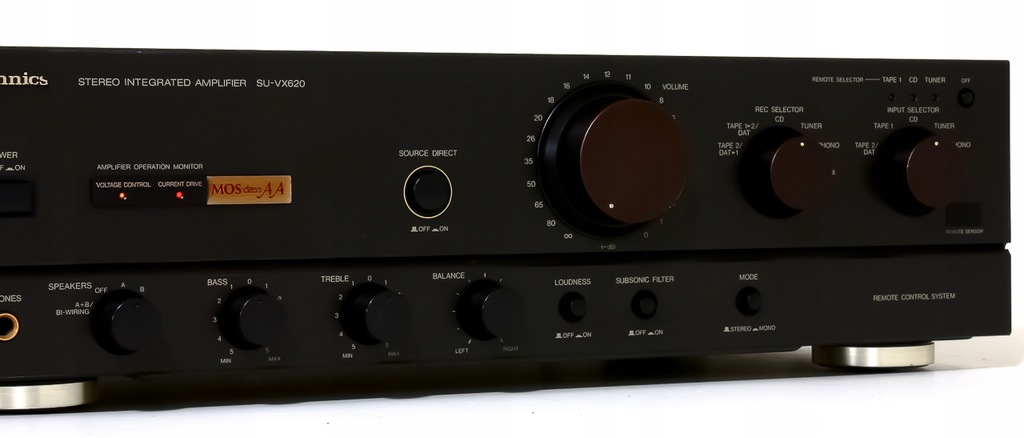 SU-VX620 to doskonale brzmiący i bardzo mocny wzmacniacz pracujący w czystej klasie AA, ma doskonały dynamiczny bas i czysty sopran, można na nim słuchać wszystkich rodzajów muzyki, jego stereofonia to dokładne odzwierciedlenie pełnej sceny muzycznej z wszystkimi detalami, tu nic nie ujdzie uwadze słuchacza jednym słowem bardzo dobry wzmacniacz do słuchania muzyki i to bardzo głośno. To naprawdę super wzmacniacz o żywym i pełnym dźwięku, na fundamencie mocnego i sprężystego basu. Jego nieocenioną zaletą jest funkcja LOUDNESS - podbicie dynamiki, sprawia ona że dźwięk staje się potężniejszy i bogatszy w bas i soprany. Panel przedni wykonany z aluminium. Zapraszam do zakupu!