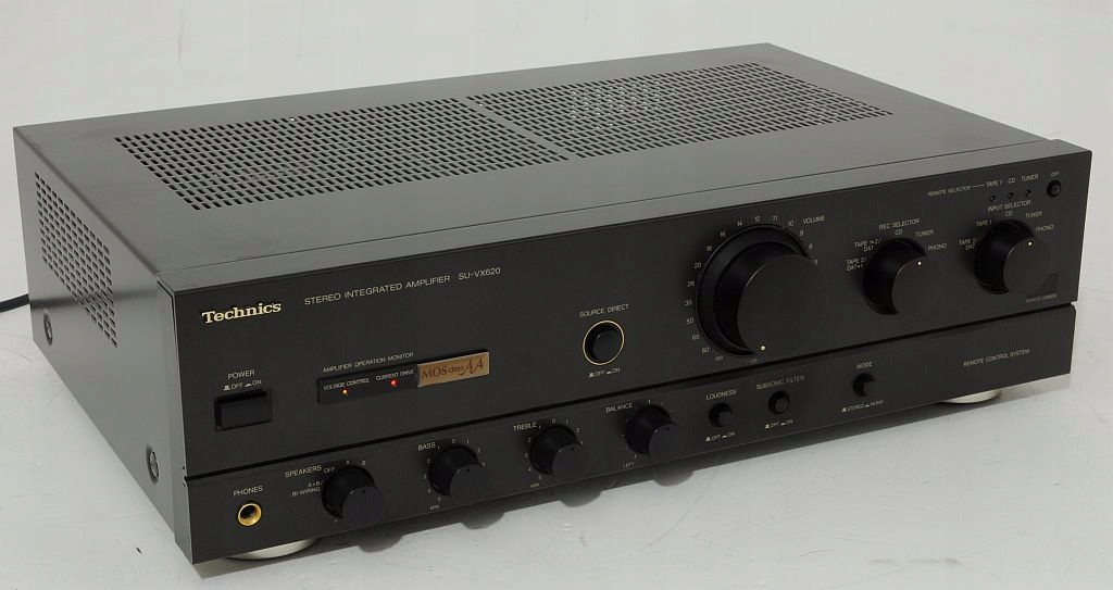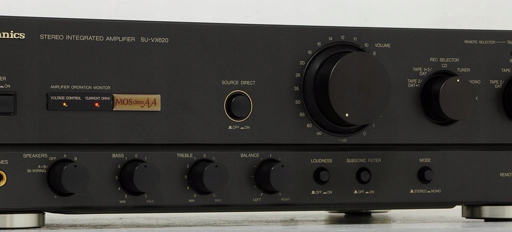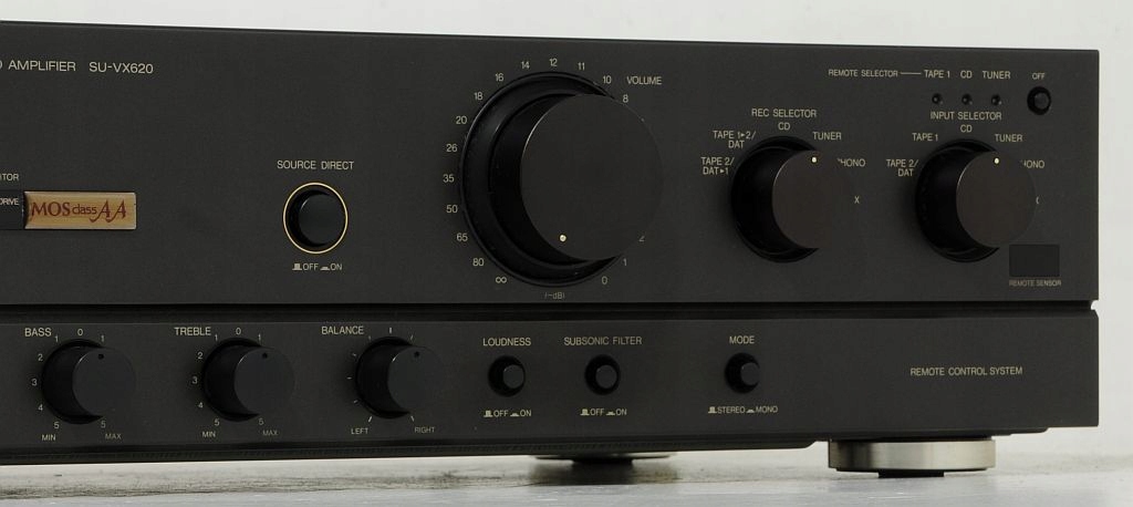 SU-VX620 to doskonale brzmiący i bardzo mocny wzmacniacz pracujący w czystej klasie AA, ma doskonały dynamiczny bas i czysty sopran, można na nim słuchać wszystkich rodzajów muzyki,jego stereofonia to dokładne odzwierciedlenie pełnej sceny muzycznej z wszystkimi detalami, tu nic nie ujdzie uwadze słuchacza jednym słowem bardzo dobry wzmacniacz do słuchania muzyki i to bardzo głośno. To naprawdę super wzmacniacz o żywym i pełnym dźwięku, na fundamencie mocnego i sprężystego basu. Jego nieocenioną zaletą jest funkcja LOUDNESS - podbicie dynamiki, sprawia ona że dźwięk staje się potężniejszy i bogatszy w bas i soprany. Panel przedni wykonany z aluminium.