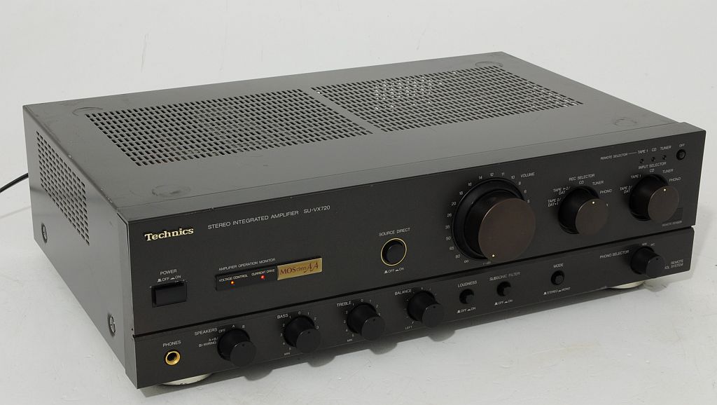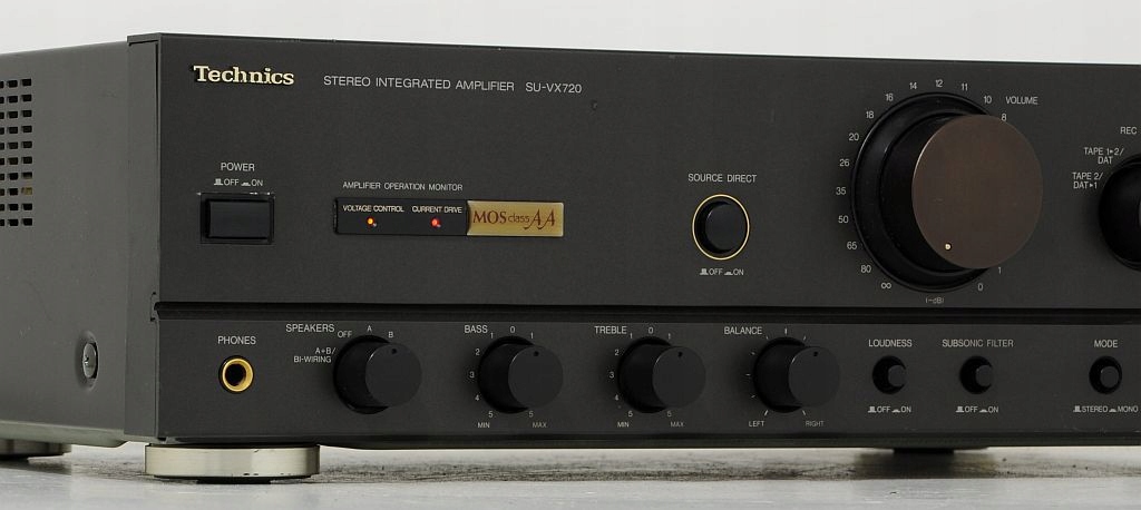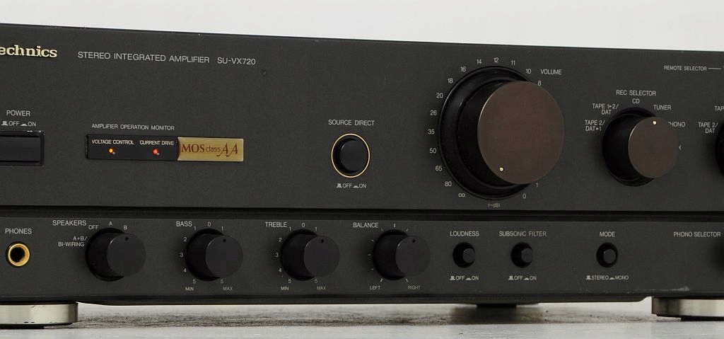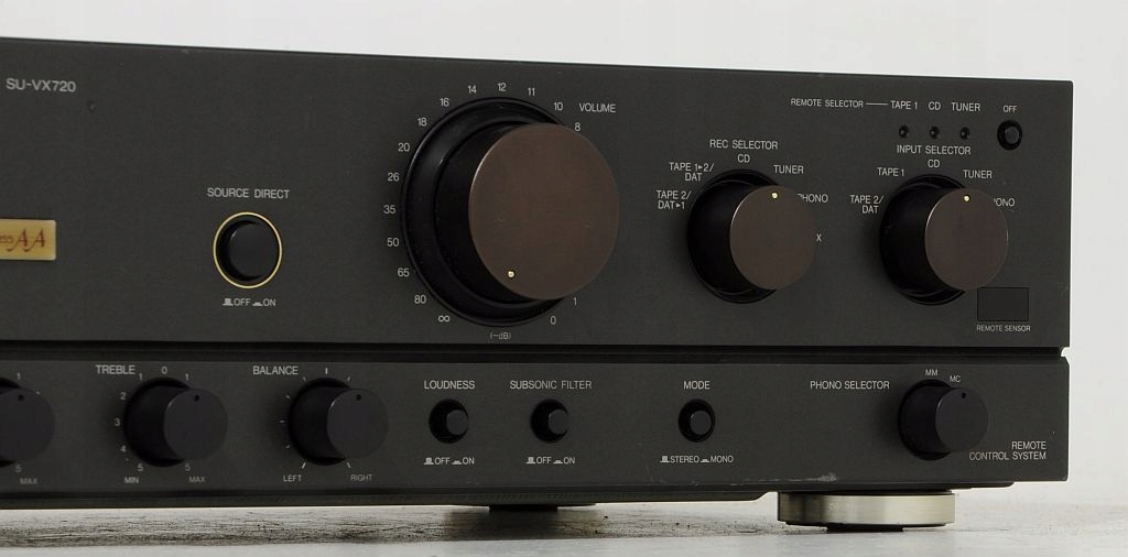 SU-VX720 to doskonale brzmiący i bardzo mocny wzmacniacz pracujący w czystej klasie AA, ma doskonały dynamiczny bas i czysty sopran,można na nim słuchać wszystkich rodzajów muzyki,jego stereofonia to dokładne odzwierciedlenie pełnej sceny muzycznej z wszystkimi detalami, tu nic nie ujdzie uwadze słuchacza jednym słowem bardzo dobry wzmacniacz do słuchania muzyki i to bardzo głośno. To naprawdę super wzmacniacz o żywym i pełnym dźwięku, na fundamencie mocnego i sprężystego basu. Jego nieocenioną zaletą jest funkcja LOUDNESS - podbicie dynamiki, sprawia ona że dźwięk staje się potężniejszy i bogatszy w bas i soprany. Panel przedni wykonany z aluminium.