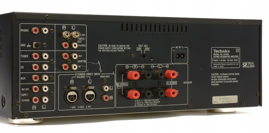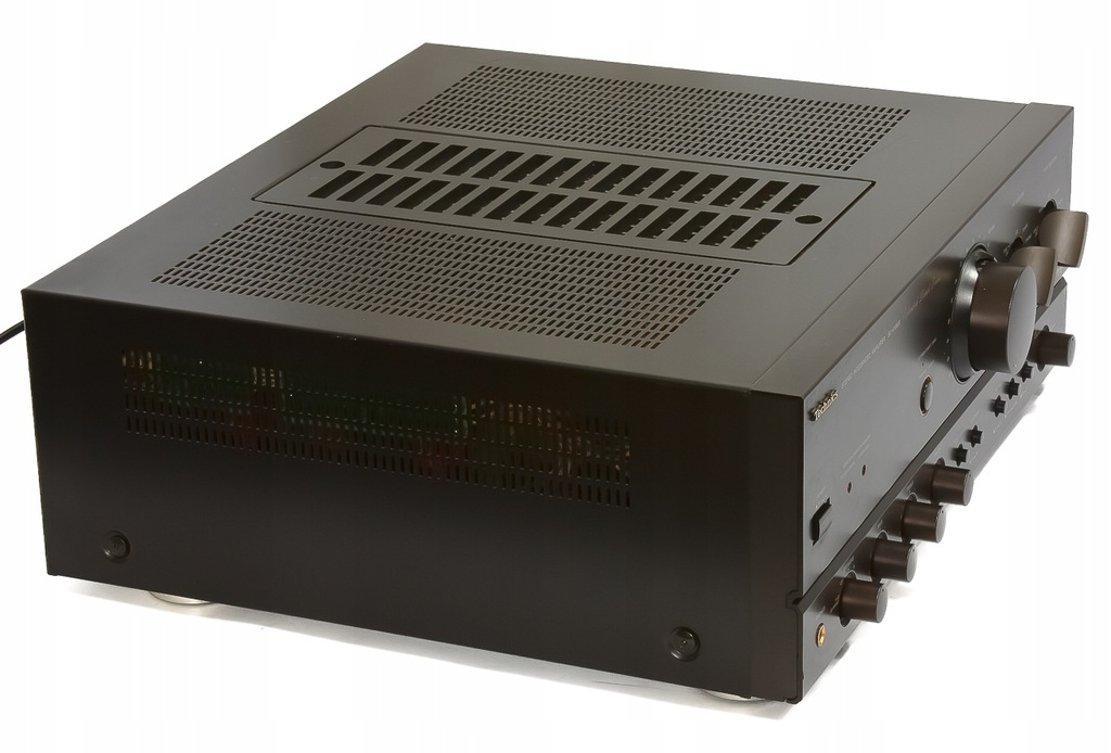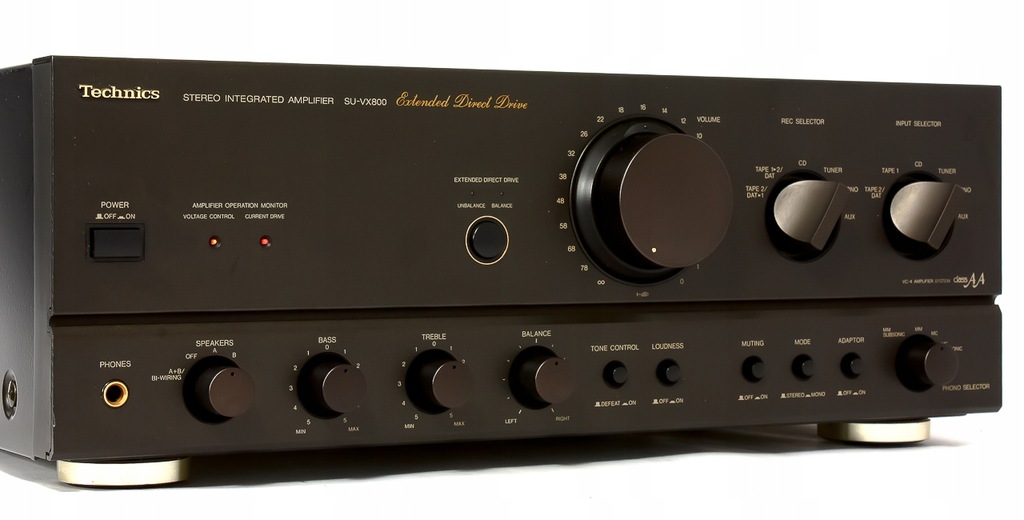 Potężny i najmocniejszy wzmacniacz Technicsa z audiofilskimi wejściami Balance XLR o niesamowicie czystym i dynamicznym brzmieniu, szerokiej i barwnej scenie muzycznej i stereofonii na wysokim poziomie. To absolutnie najwyższy i najmocniejszy Technics jakiego wyprodukowano w Japonii, to kwintesencja wysokiej jakości dźwięku i potężnego wzmocnienia. TECHNICS SU-VX800 Extended Direct Drive CLASS AA VC-4 AMPLIFIER HI-END CLASS!!!!! To niemożliwie mocny i najlepszy dźwiękowo, audiofilski wzmacniacz, jaki skonstruowali samurajowie z Technicsa dla fanatyków dźwięku. Konstrukcja składająca się z łącznie z 8 końcówek mocy(4 końcówki mocy główne dla 2 kanałów stereo na przód i tył VC-4 Amplifier System,oraz 4 końcówki zintegrowane dla podłączenia w trybie Extended Drive-Balance i Unbalance, które tworzą stereofonię na wysokim poziomie bez zniekształceń z niesamowitą dynamiką o potężnym i głębokim basie i powiem szczerze że tylko mocne kolumny wytrzymają pełne obciążenie i wciśnięcie przycisku loudnes. Ten wzmacniacz idealnie odwzorowuje każdy szczegół, ma doskonałą scenę muzyczną on po prostu poraża dźwiękiem. Wzmacniacz zasilany jest ogromnym transformatorem z czystej beztlenowej miedzi OFC i wsparty 2 kondensatorami X-PRO class AA 1500mf, końcówka mocy we wzmacniaczu została podzielona na 2 końcówki dla kolumn przednich i tylnych lewego kanału i prawego kanału to jest V-C4 Amplifier system. Dzięki takiemu rozwiązaniu uzyskano tak potężne wzmocnienie z jednoczesną dbałością o brzmienie. Po podłączeniu na 4 kolumny przedmioty znajdujące się w pobliżu pękają :) . Wzmacniacz skierowany był przede wszystkim do zamożnych klientów jego cena to około 4800 zł no, ale za taki dźwięk trzeba tyle zapłacić, tego modelu nie ma w żadnym katalogu Technicsa ze zwykłym sprzętem. Jest natomiast pokazany w serii Digital Reference of Technics z 2 innymi modelami niestety jeszcze droższymi, jego cyfrowy odpowiednik przekroczył cenę 8000DM . To absolutnie najwyższa klasa, która wręcz wylewa miód na nasze uszy. Ten wzmacniacz to senne marzenie fanów Technicsa niestety tylko marzenie, bo na naszym rynku nawet o nim nie wspomniano ze względu na cenę. Zapraszam do zakupu!
